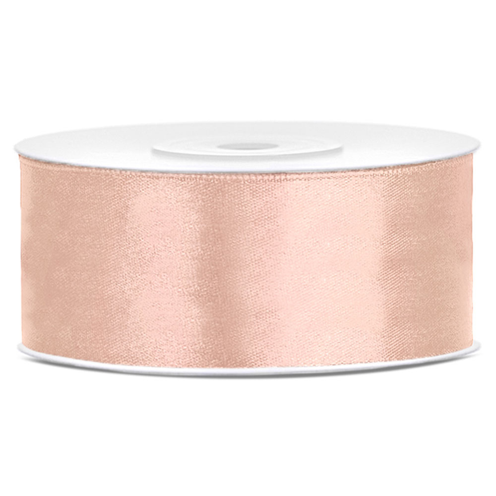 Satinband Ljus Persika 25 mm omfattar ett satinband på rulle i en ljus persikofärg. Bandet är tillverkat av polyester och är ca 25 mm brett och 25 meter långt.