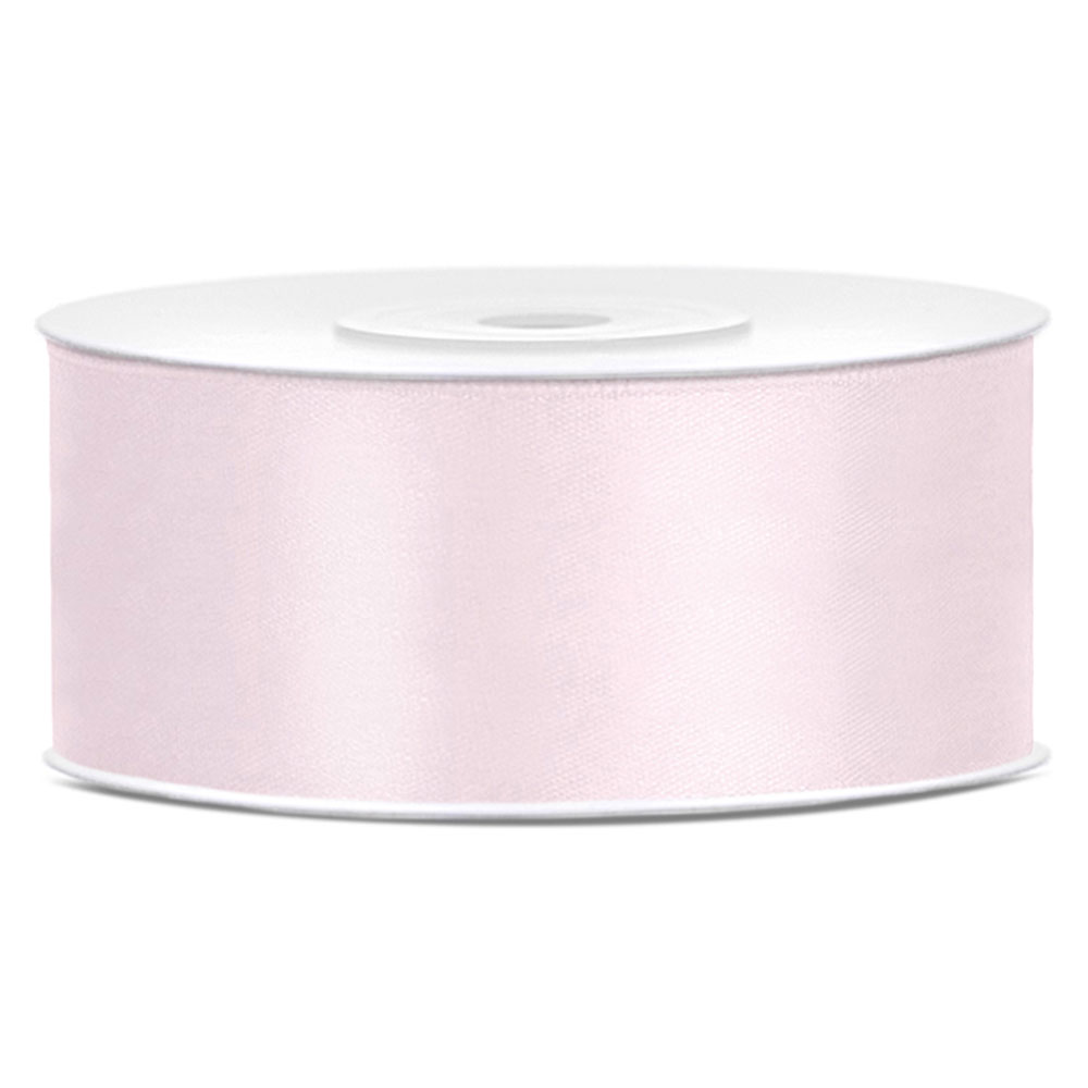Satinband Ljus Puderrosa 25 mm omfattar ett satinband på rulle i en ljus puderrosa färg. Bandet är tillverkat av polyester och är ca 25 mm brett och 25 meter långt.