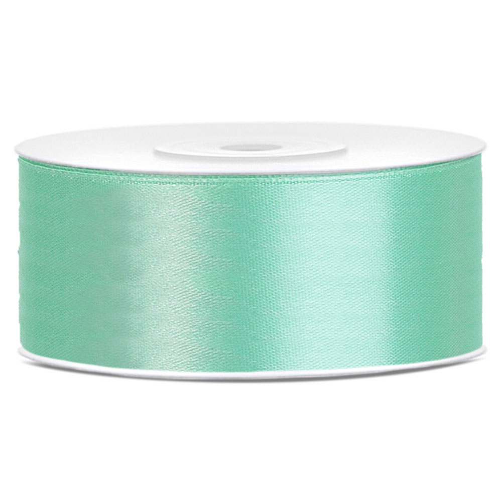 Satinband Mintgrön 25 mm omfattar ett mintgrönt satinband av polyester på rulle. Bandet är 25 mm brett och 25 meter långt.
