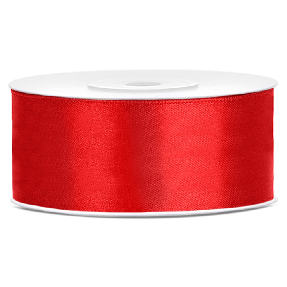 Satinband Röd 25 mm omfattar ett rött satinband av polyester på rulle. Bandet är 25 mm brett och 25 meter långt.
