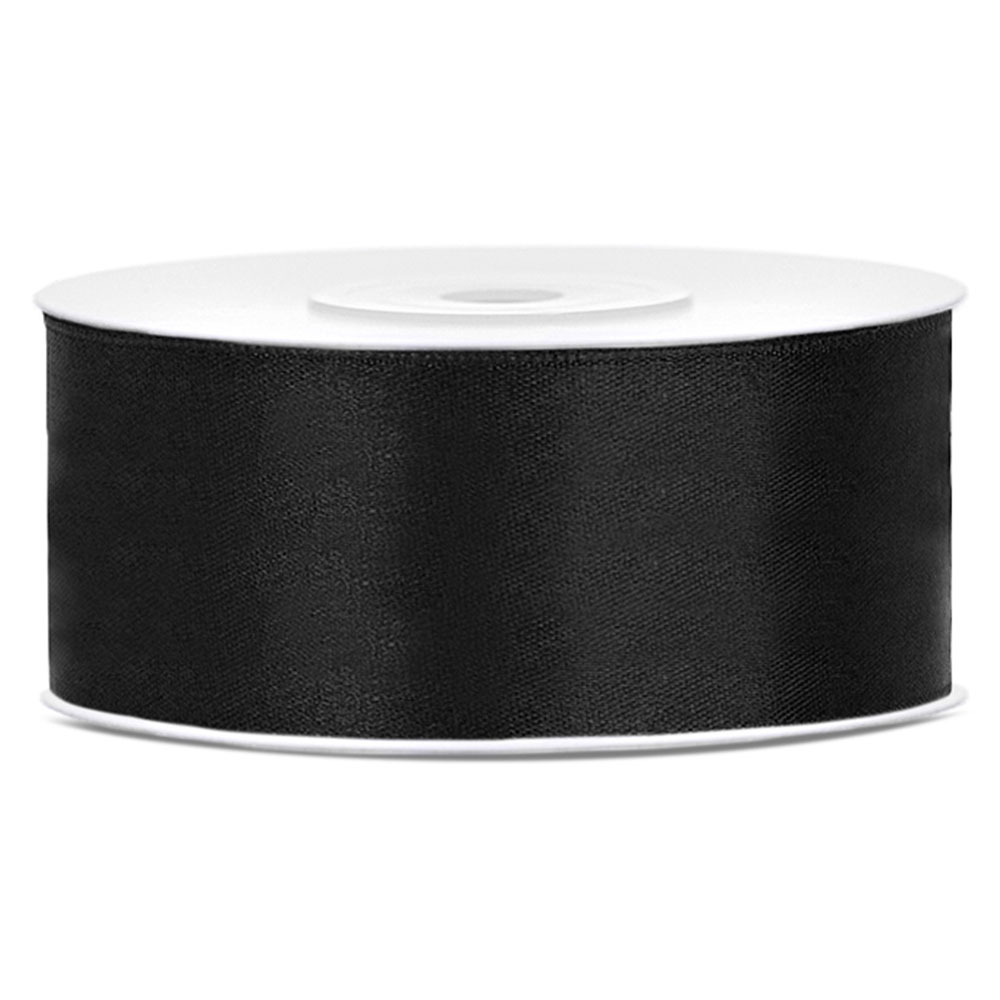 Satinband Svart 25 mm omfattar ett svart satinband av polyester på rulle. Bandet är 25 mm brett och 25 meter långt.