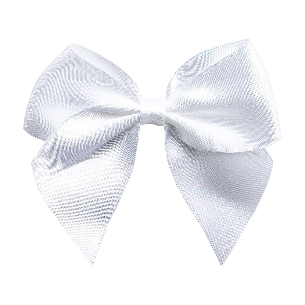 Satinrosetter Vit omfattar ett 6-pack vita satinrosetter av polyester. Rosetterna har självhäftande baksida och är ca 10 cm breda och 8,5 cm långa.