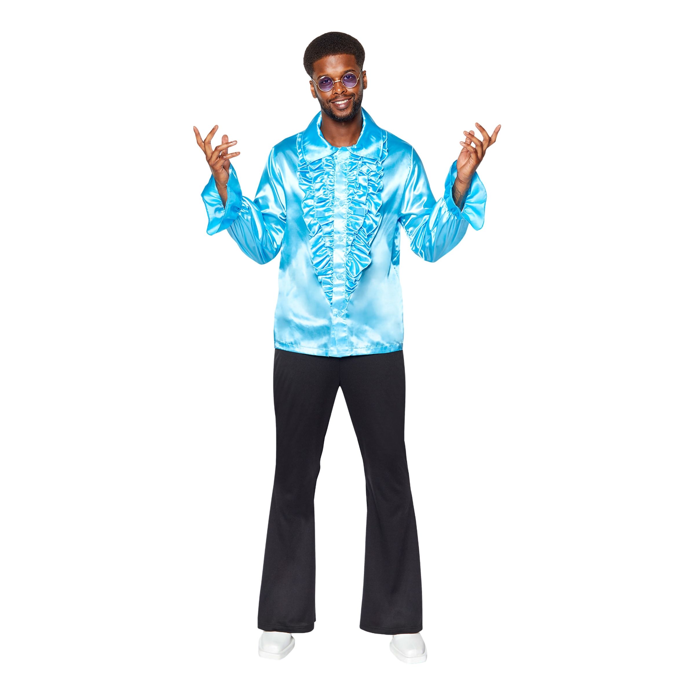 Satinskjorta Ljusblå är en blå kråsskjorta med utsvängda ärmar och kommer i storlekar som passar vuxna (herrmodell). Matcha gärna skjortan med ett par utsvängda 70-talsbyxor för en komplett outfit.