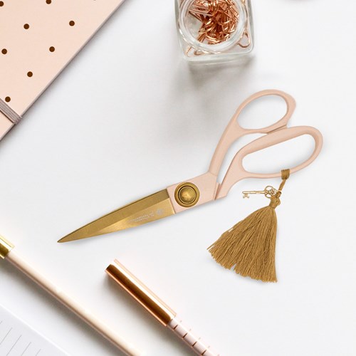 Låt denna snygga sax pryda ditt skrivbord på hemmakontoret eller arbetsplatsen. Med guldfärgade blad och dekoration i form av tofs och berlock blir kontoret snyggare och arbetet lite roligare att utföra. Passar till både stort och smått som ska klippas, allt från papper och snören till annat pyssel och kontorsarbete.