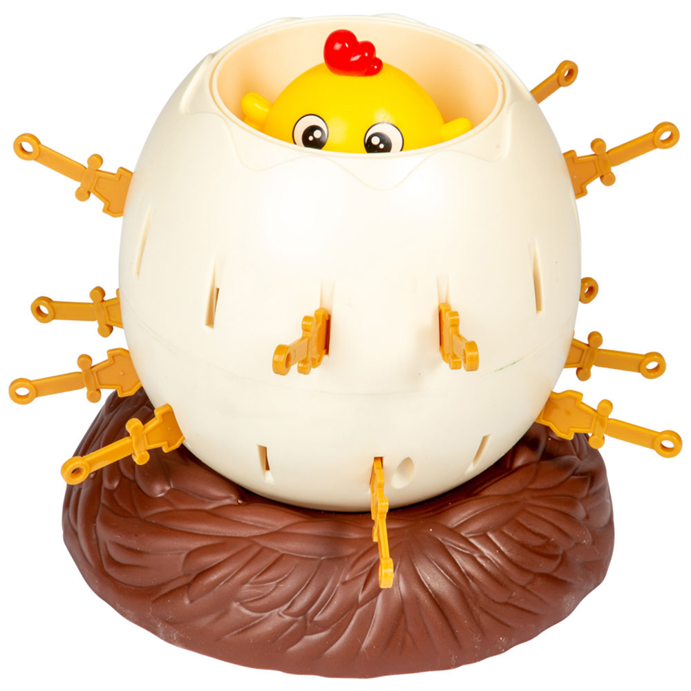 Scared Chicken Spel omfattar ett roligt sällskapsspel där man genom att skjuta in svärd i ägget ser vem som skrämmer kycklingen till att kläckas och hoppa upp. Instruktioner för spel finns på förpackningen.