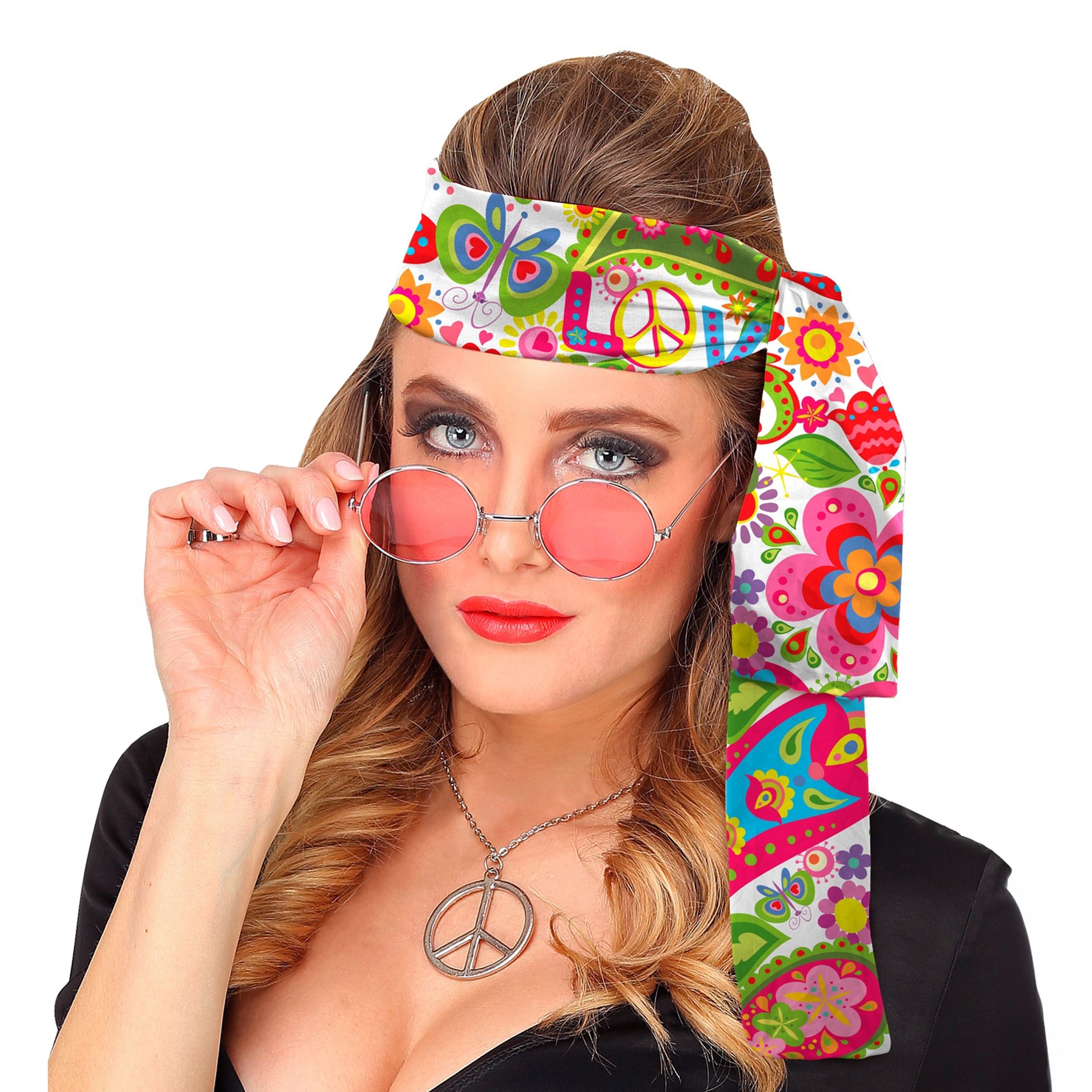 Scarf Flower Power Vit är ett hippieinspirerat band med motiv av färgglada blommor, peacemärken och stjärnor. Knyt det runt huvudet, halsen eller armen för en snygg accessoar till 60-talsfesten!