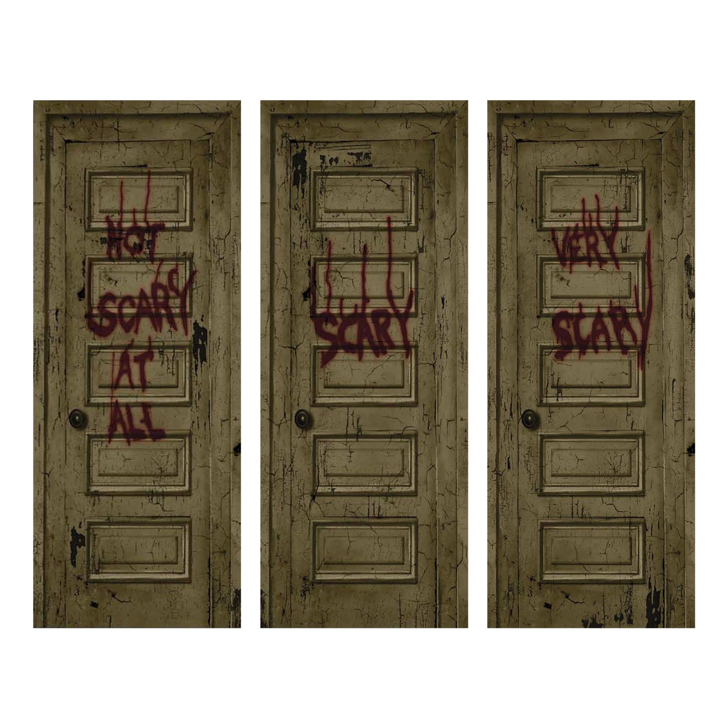 Väljer du den inte så läskiga dörren, den läskiga dörren, eller den jätteläskiga dörren? Nästa halloween är valet äntligen ditt! Gör festen lite extra otäck med dessa blodiga dörrdekorationer som appliceras på väggen.