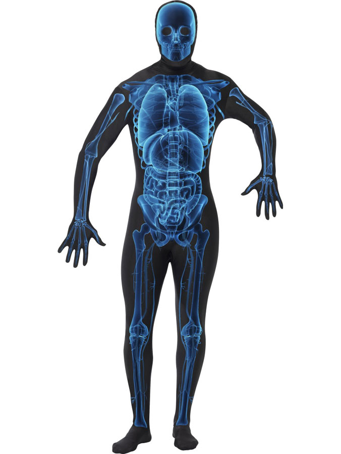 Second Skin X-Ray Maskeraddräkt omfattar en svart helkroppsstrumpa tillverkad av lycra med motiv av en röntgenbild. Dräkten kommer med en dold dragkedja baktill och du dessutom så kan du lyfta upp masken under hakan för eventuella drinks/snacks.