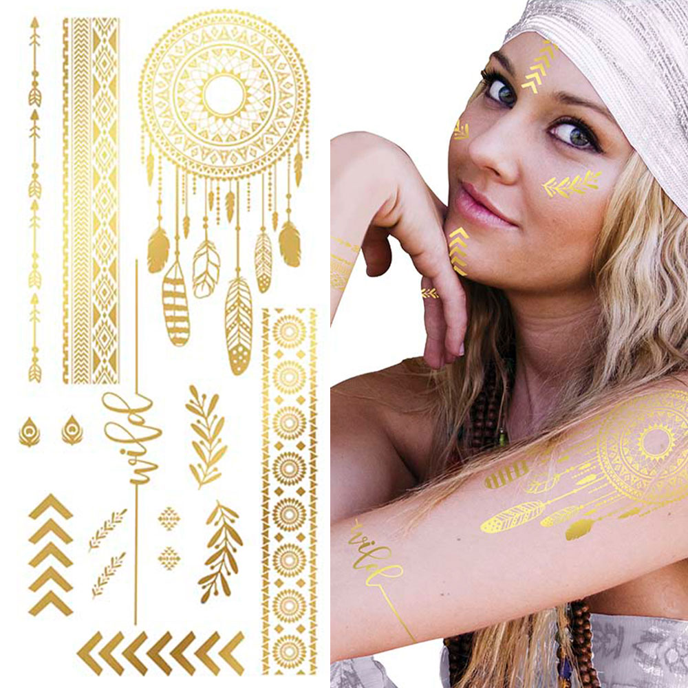 Förvandla din stil med våra temporära tatueringar i guld som erbjuder unika hippie-inspirerade mönster. Få en glittrande look som ser fantastisk ut och enkelt tas bort när du vill byta stil.