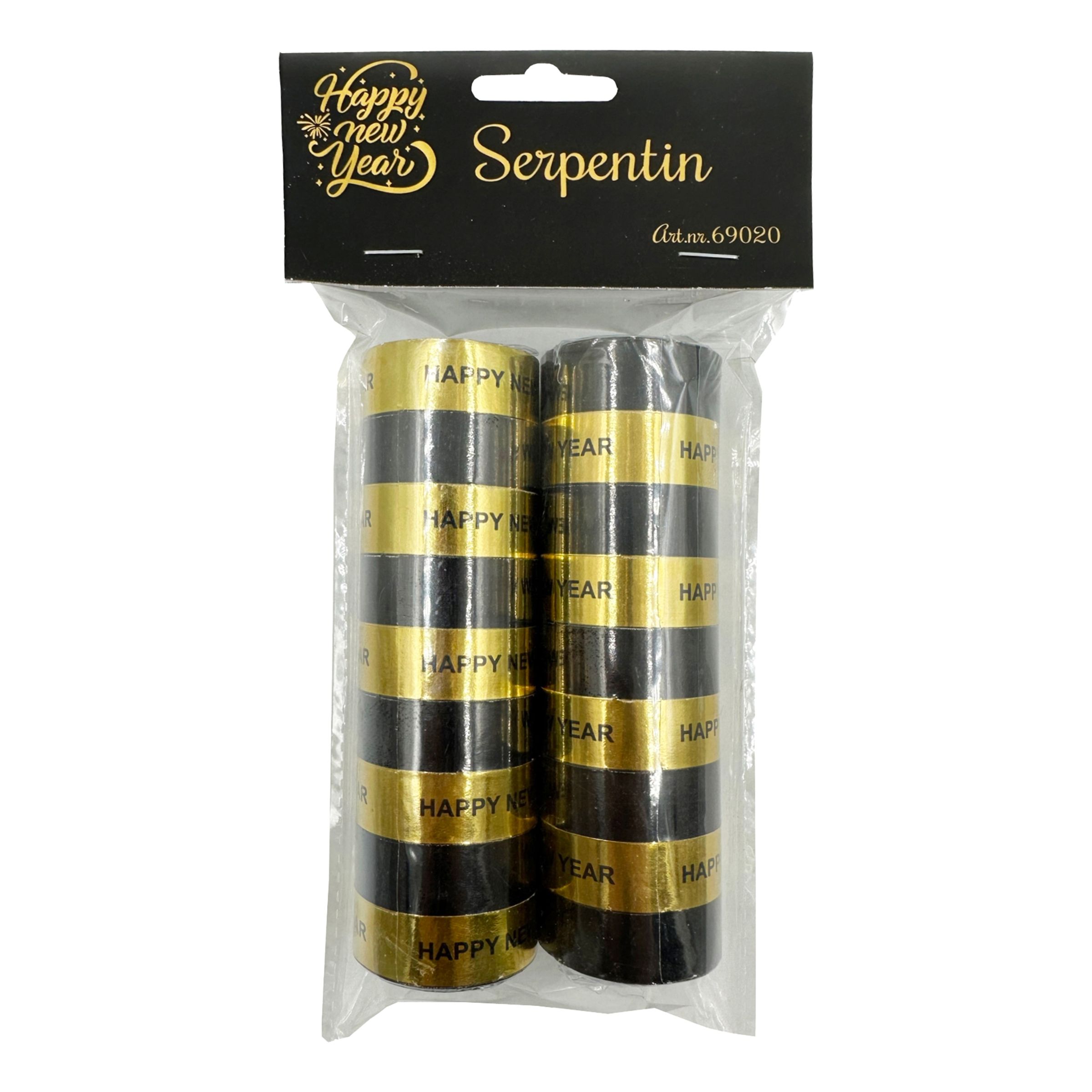 Serpentin Happy New Year inkluderar två stycken serpentiner i svart och guld med texten "Happy New Year" på. Perfekt till nyår!