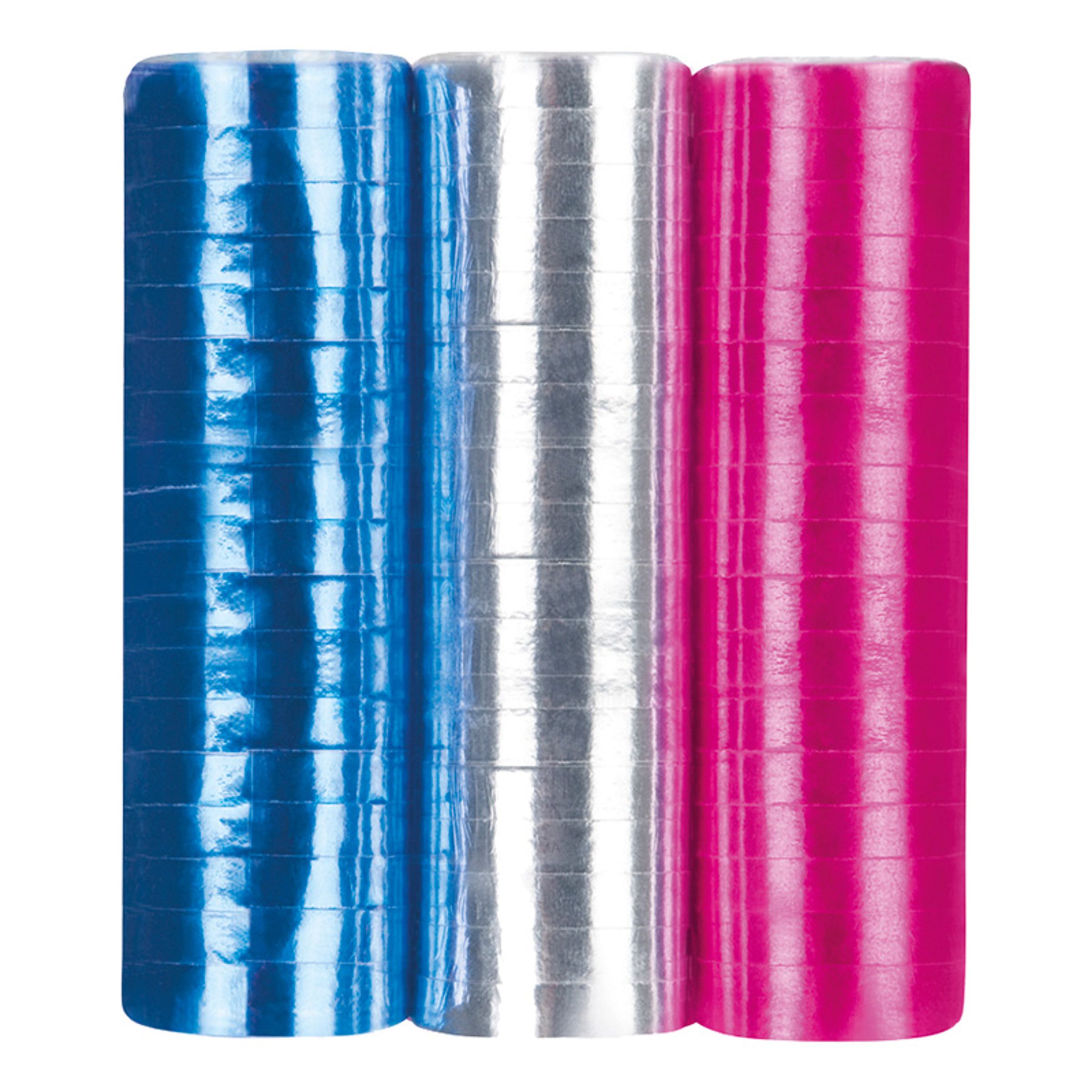 Serpentiner Disco är ett 3-pack serpentinrullar metallicfärgerna blå, silver och rosa. Varje rulle har 15-20 delar som är 4 m långa. Det här 3-packet med serpentiner tripplar effekten av glimmande dekorationer, och om du köper två 3-pack så dubblar du den trippla effekten. Det blir ett disco utan dess like.