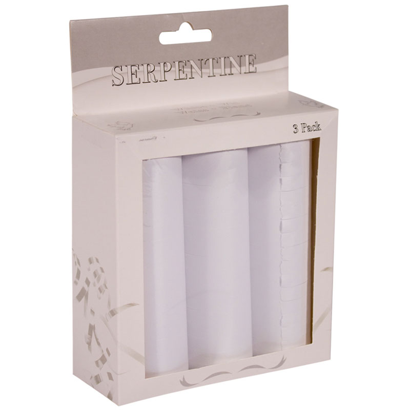 Serpentiner Vita 3-Pack omfattar tre rullar vita glansiga serpentiner i papp. Serpentinerna är ca fyra meter långa och sju millimeter breda och kommer i 3-pack.
