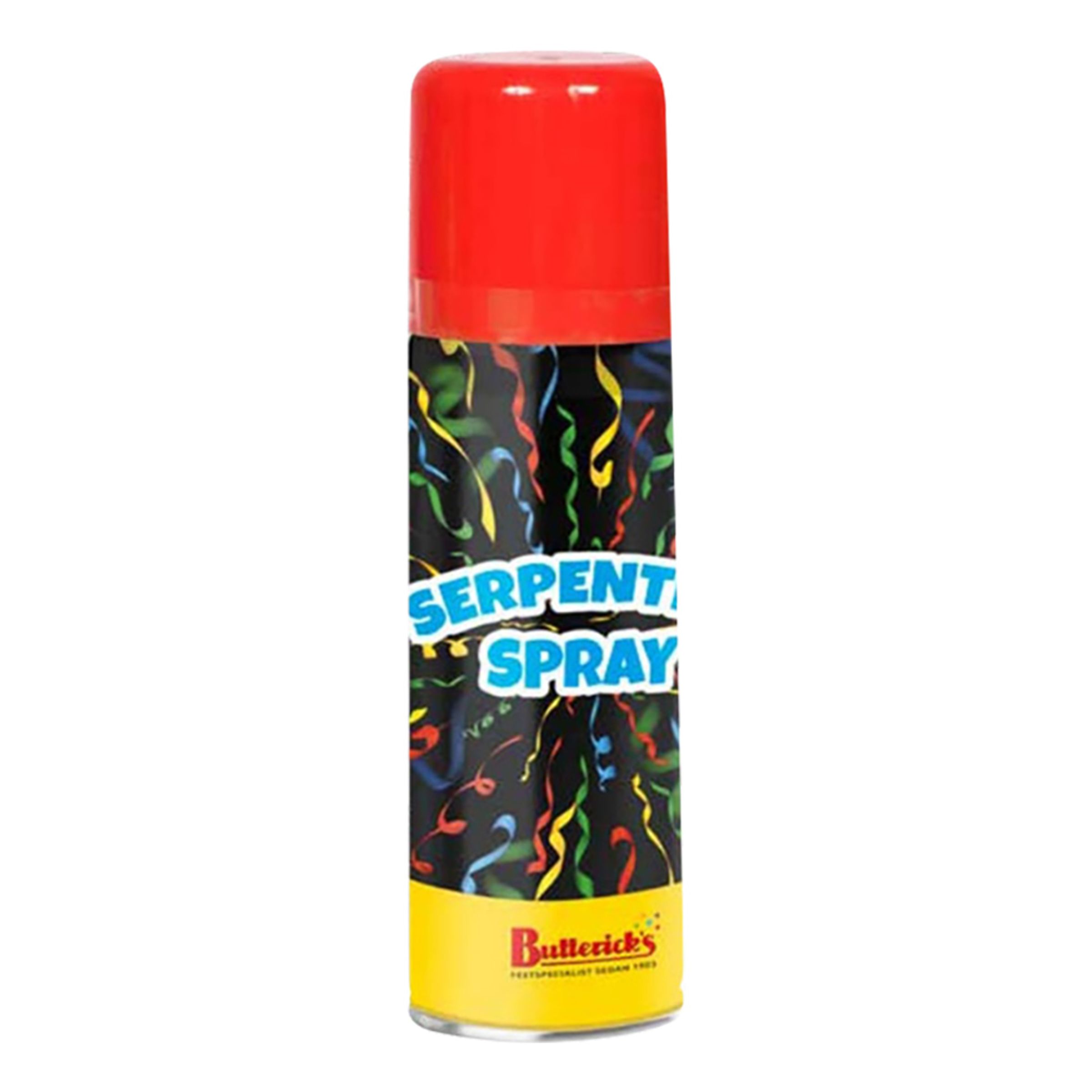 Serpentinspray är serpentin på sprayburk och kommer i färgerna blå, grön, gul och röd. Perfekt för födelsedagar, nyår, temafester eller bara för att liva upp en vanlig tisdag.