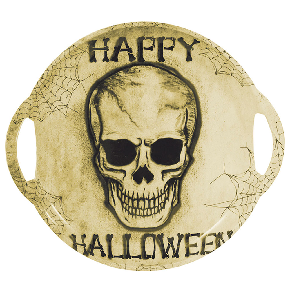 Serveringsbricka Happy Halloween omfattar en benvit serveringsbricka, dekorerad med en dödskalle, flera svarta spindelnät och texten "HAPPY HALLOWEEN" i svart.