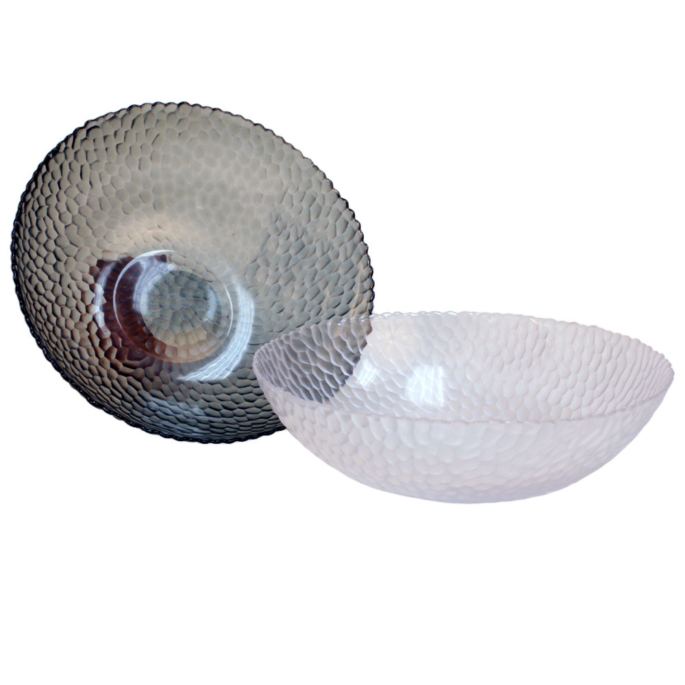 Serveringsskål Plast omfattar en uppläggningsskål i plast med ett fjälligt mönster. Finns som helt genomskinlig eller som grå genomskinlig, vilken du får blir en överraskning.