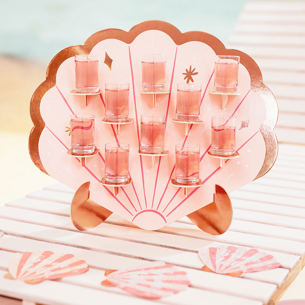 Serveringsställ för Shotglas Snäcka omfattar ett serveringsställ i form av en rosa snäcka med roséguld detaljer och utrymme för tio stycken shotglas.