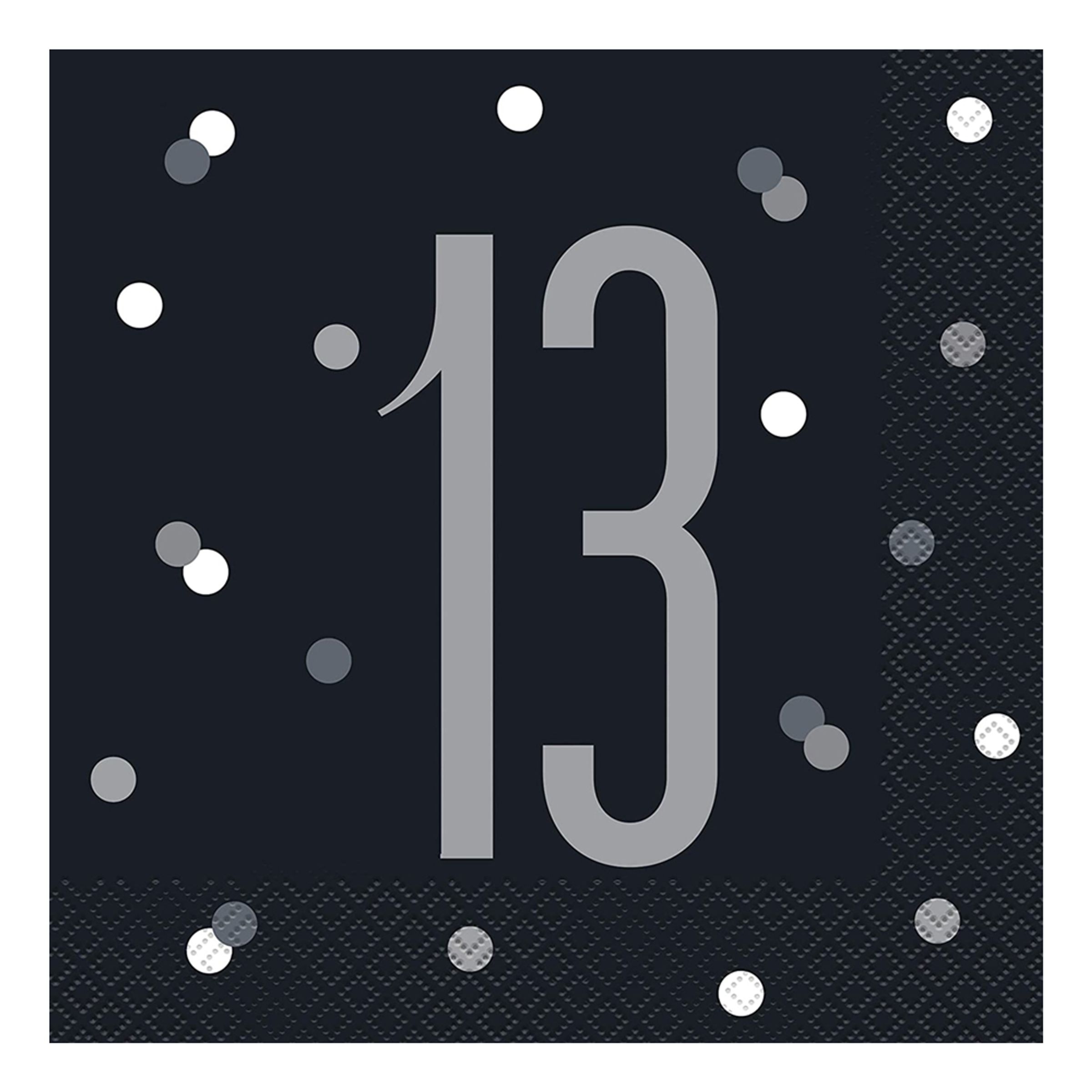 Servetter 13 Svart Prickig inkluderar 16 stycken svarta pappersservetter dekorerade med prickar och siffran 13. Servetterna är 33 x 33 cm när det är utvikta och 16,5 x 16,5 cm outvikta.