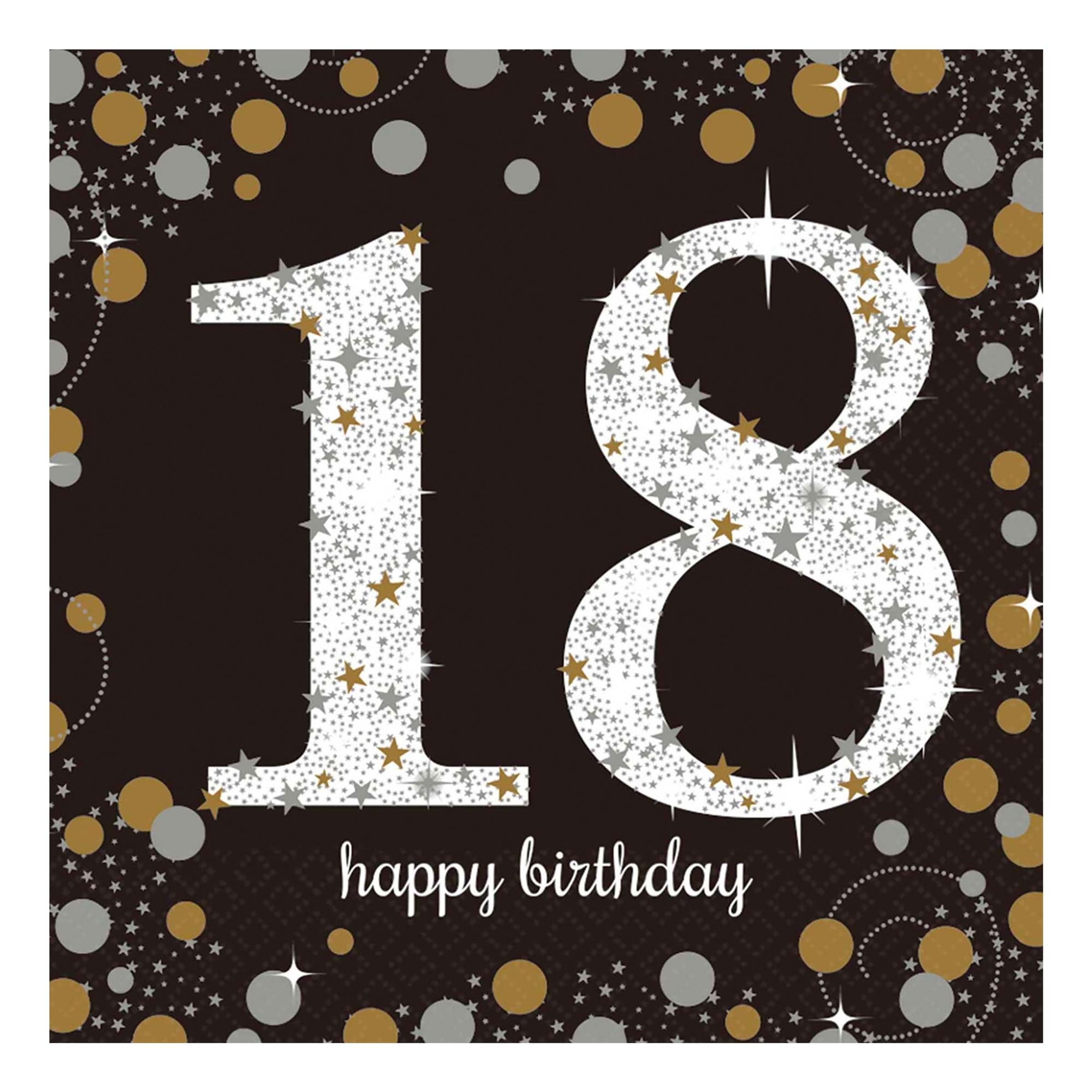 Servetter 18 Silver/Guld Glitter inkluderar 16 stycken svarta servetter med guld och silvriga detaljer. I mitten av servetten står det "18 Happy Birtday". Perfekt till födelsedagsfesten!