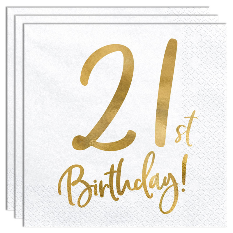 Servetter 21st Birthday omfattar vita servetter i 3 lager med texten "21st Birthday!" i skimrande guld. Servetterna mäter 33 x 33 cm utvikta och säljs i 20-pack.
