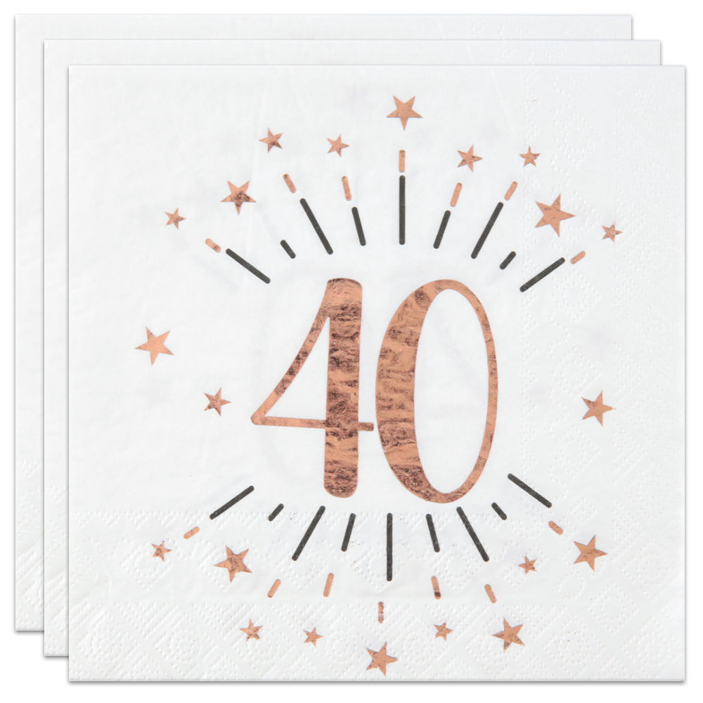 Fantastiska servetter för dig som fyller 40 år och vill duka riktigt fint! Med fina nyanser av vitt och holografiskt roseguld blir dessa 40-års servetter en riktigt stilfull detalj till din fest-dukning. Ett utmärkt val för dig som önskar en stämningsfull och riktigt tjusig dukning till din 40-års fest.