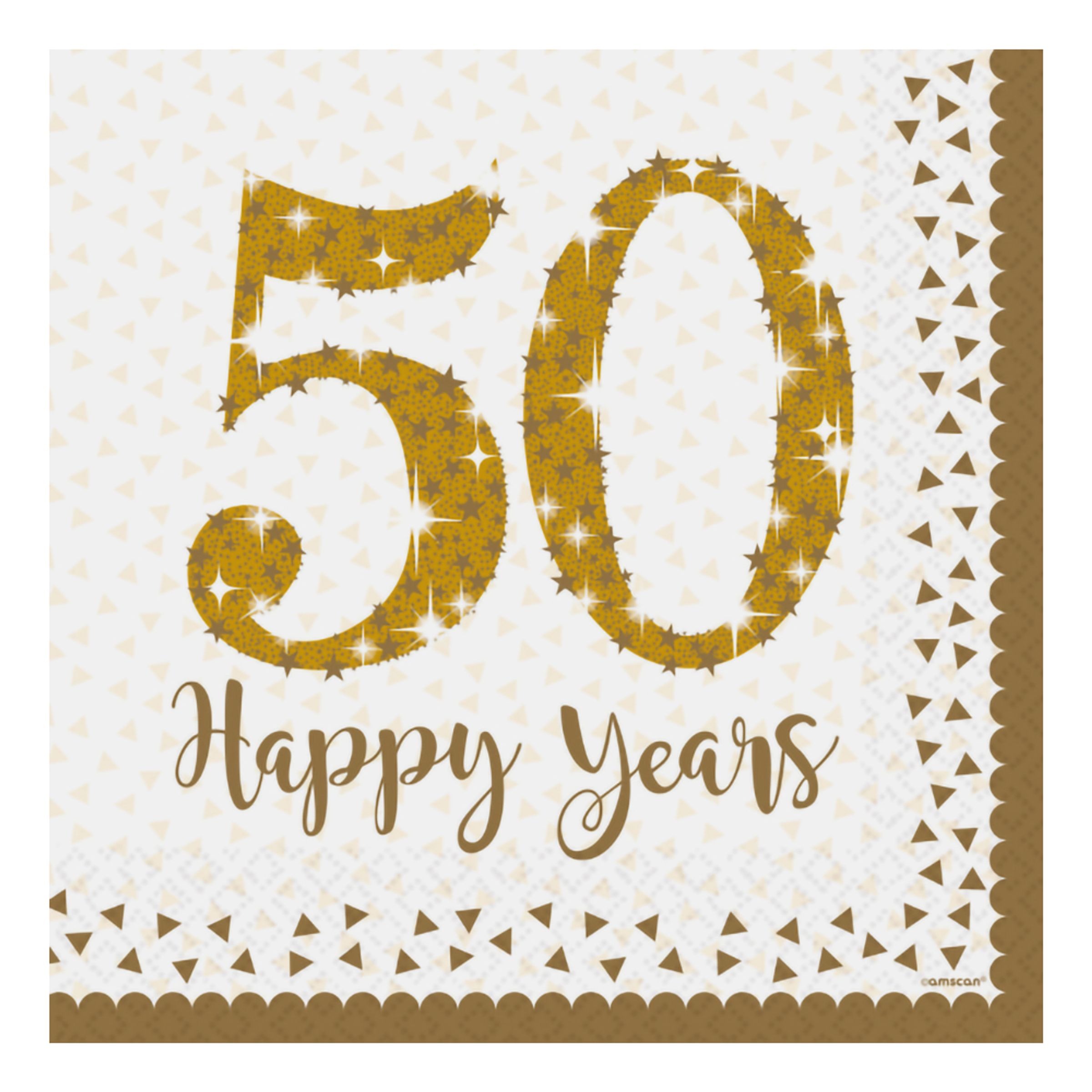 Servetter 50 Happy Years inkluderar sexton stycken vita servetter med texten "50 Happy Years" skrivet i guld. Perfekta att använda till guldbröllopet!