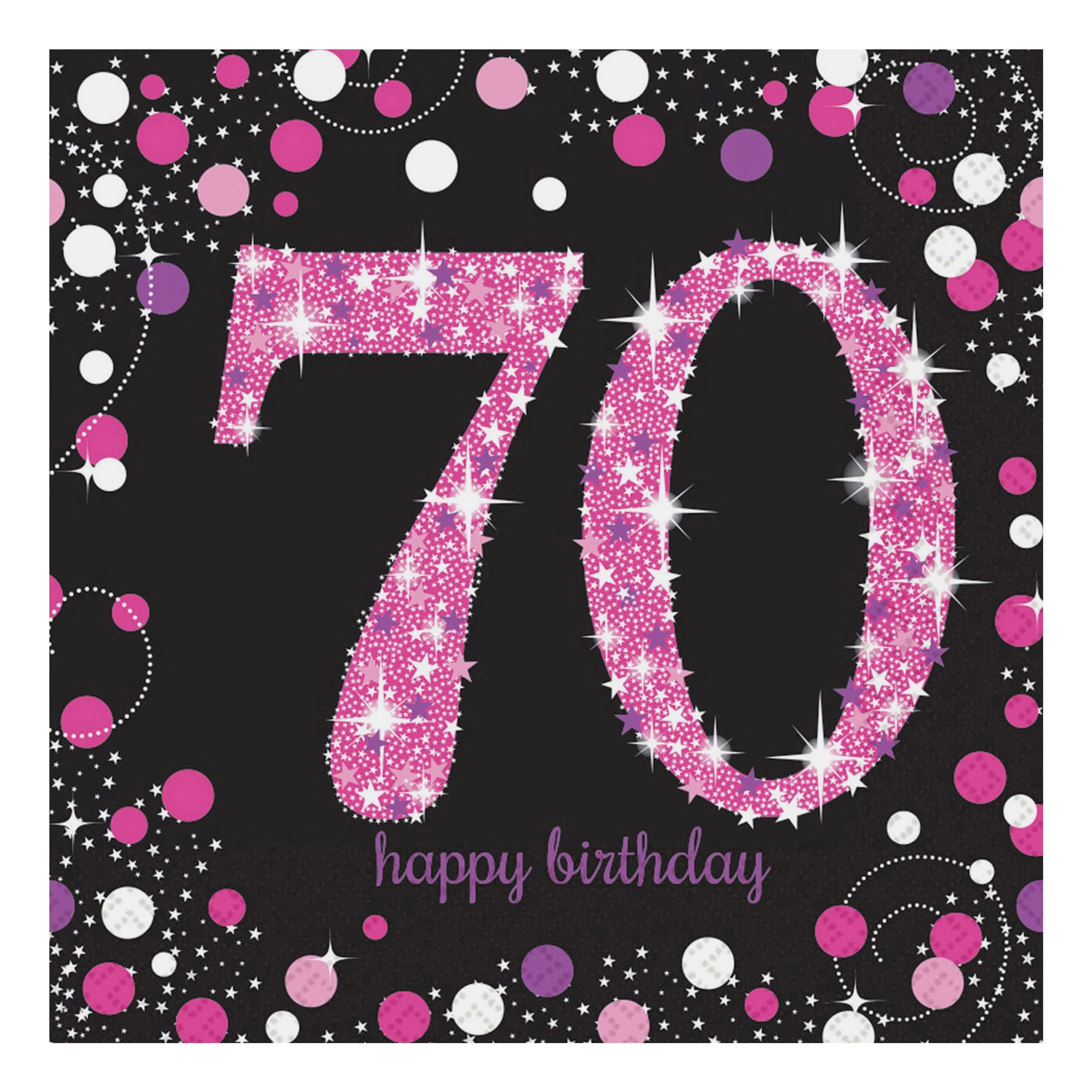 Servetter 70 Svart/Rosa Glitter inkluderar totalt sexton stycken servetter som kommer med ett rosa och svart motiv med texten "70" och "Happy Birthday". Perfekt till 70-årskalaset!