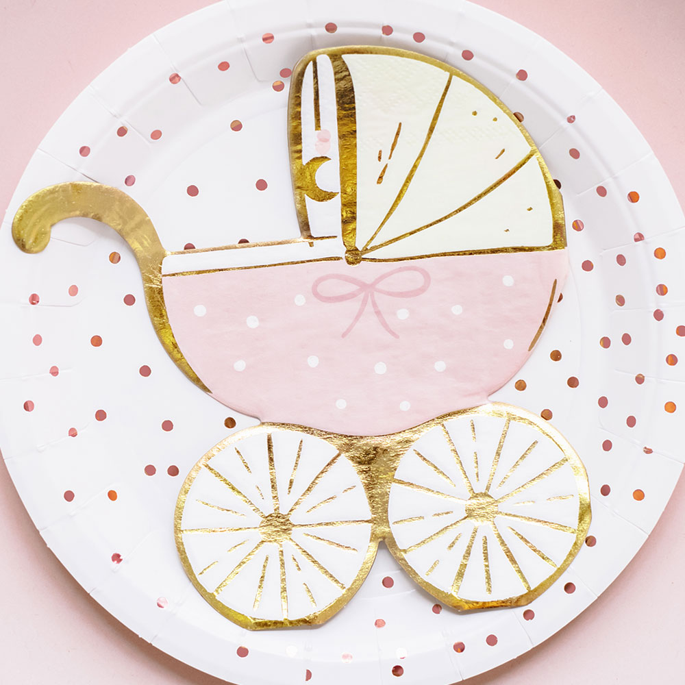 Servetter Barnvagn Ljusrosa omfattar ett 20-pack servetter i for av en rosa barnvagn med fina gulddetaljer.