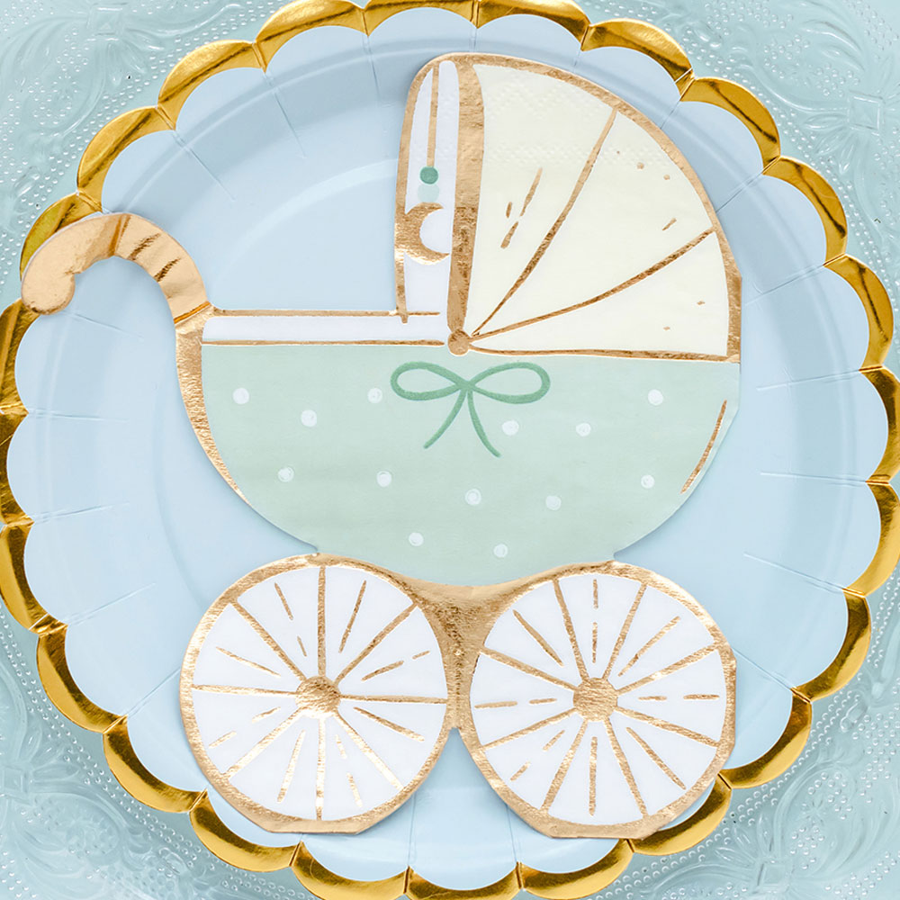 Servetter Barnvagn Turkos omfattar ett 20-pack servetter i form av en turkos och vit barnvagn med fina gulddetaljer.