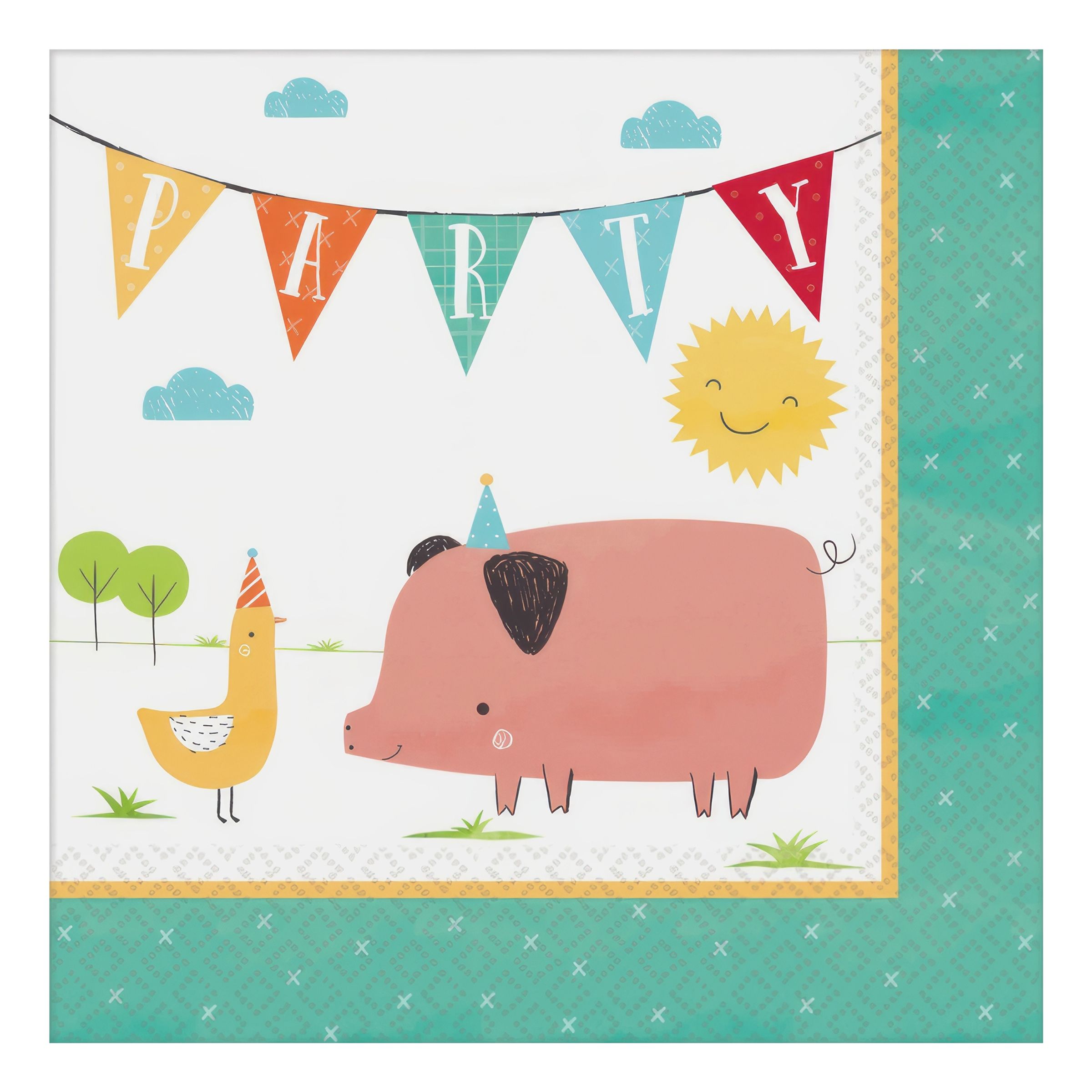Servetter Bondgård innehåller 16 stycken servetter i papper som samtliga mäter 33 x 33 cm och pryds av kalasande djur i partyhatt. Bra att ha på fikabordet när det kladdas och spills!