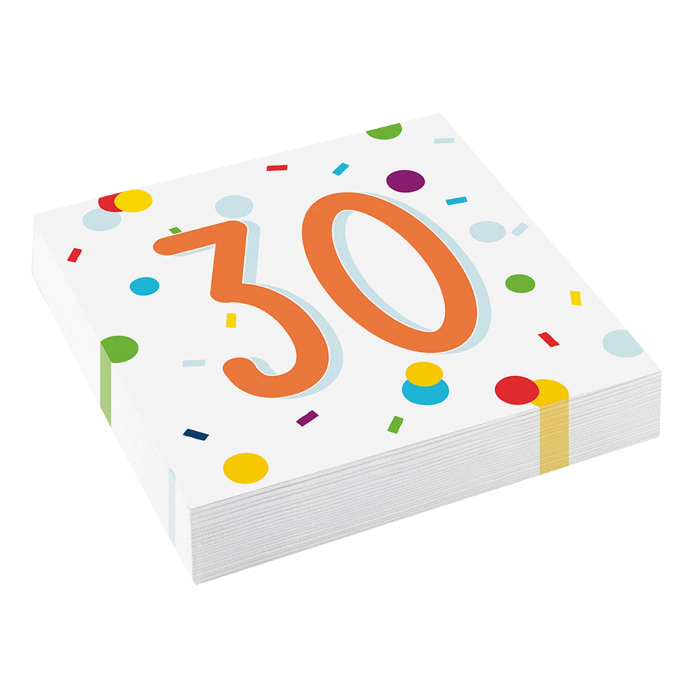 Servetter Confetti Birthday 30 inkluderar totalt tjugo stycken vita servetter med konfetti-motiv och siffran "30" skrivet i orange. Ett måste till dukningen på 30-årsfesten!