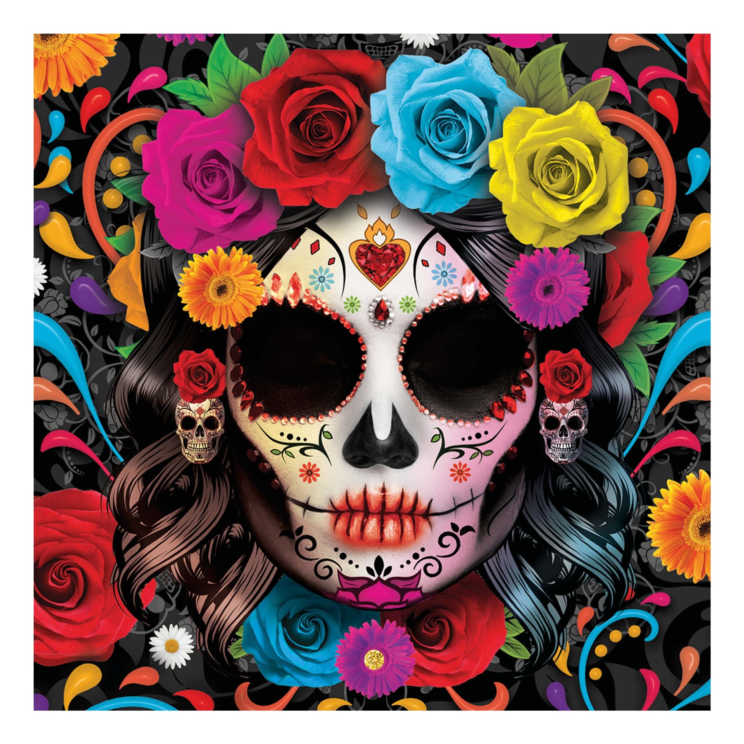 Servetter Day of the Dead är svarta papptallrikar med coolt motiv av en dödskallesminkad dam tillsammans med flerfärgade rosor och mönster.
