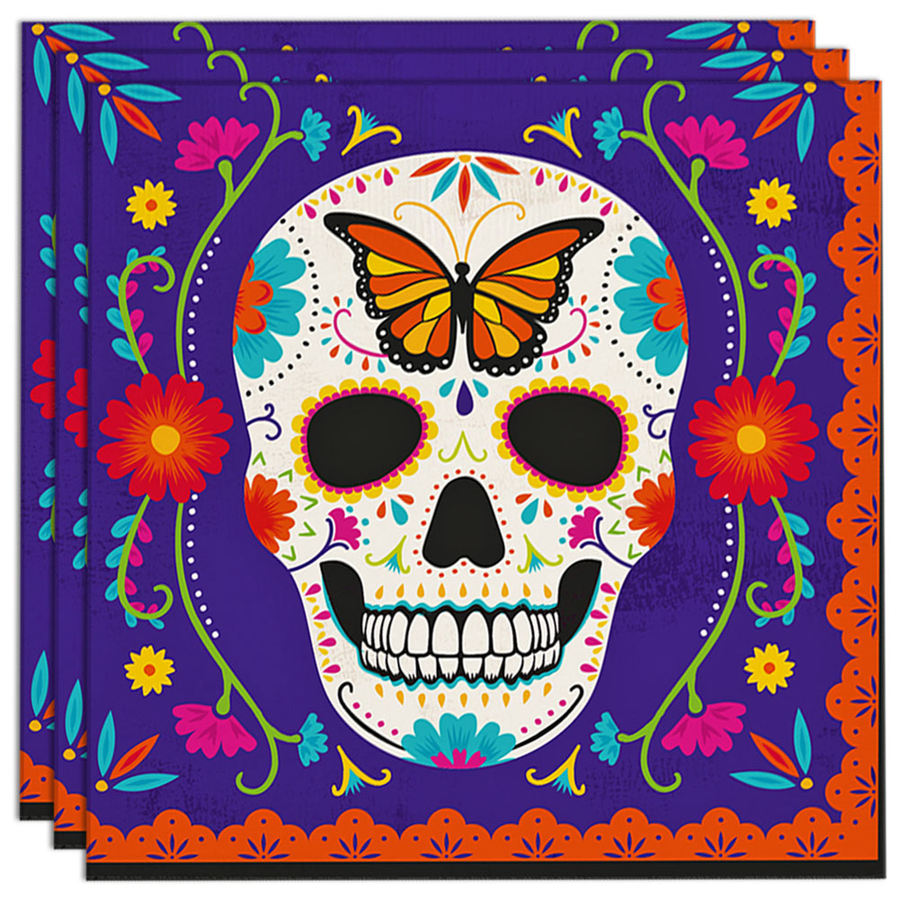 Servetter Day of the Dead omfattar ett 16-pack servetter med Day of the Dead motiv, med en stor dödskalle i mitten med en fjäril i pannan, omgiven av olika färger och mönster, ena sidan har lila bakgrund och den andra turkos.