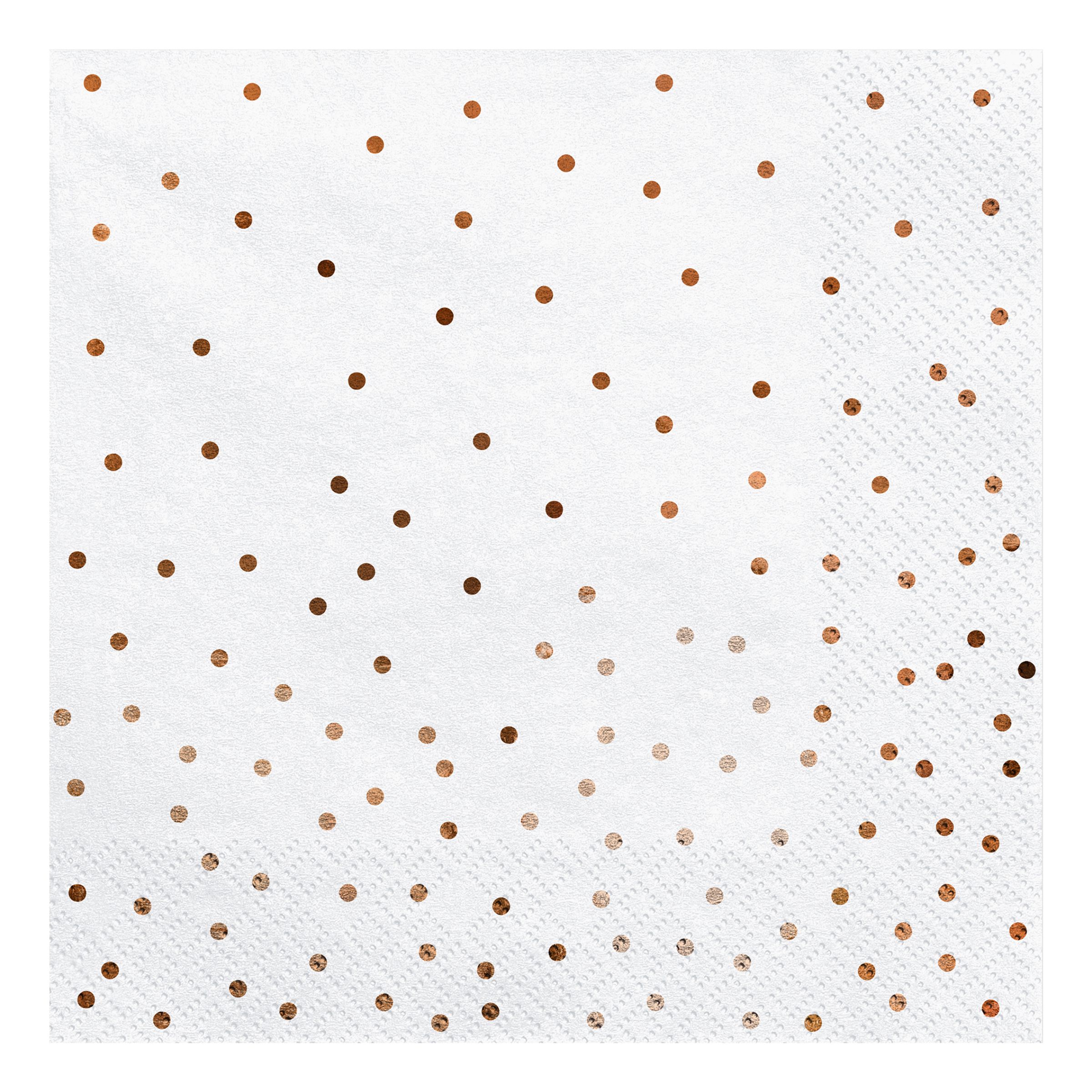 Servetter Dots Roséguld är 3-lagers pappersservetter i vit färg med ett dekorativt mönster av små, guldfärgade prickar. Servetterna har endast tryck på framsidan, övriga sidor är helvita.