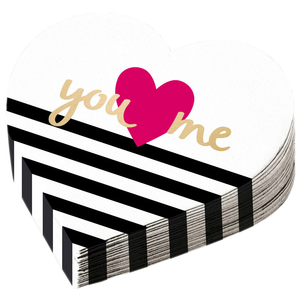 Servetter Everyday Love omfattar ett 12-pack hjärtformade servetter i vitt med svarta ränder och texterna "You" och "Me" vid ett rosa hjärta. Servetterna är tillverkade av papper och mäter ca 32 cm i diameter utvikta.