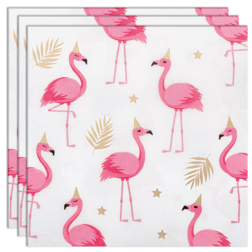 Vill du ha en fin och festlig dukning till sommarfest och kalas är dessa kalas servetter med flamingo tema ett utmärkt val! Flamingo servetter passar perfekt till sommar party och tema fest för alla som gillar rosa flamingos med guldiga partyhattar!