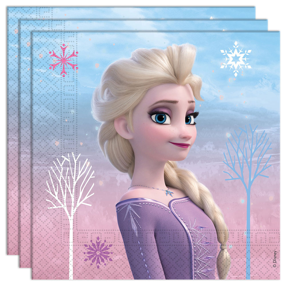 Duka upp en matchande dukning till ditt Frozen tema-kalas och sätt pricken över i med dessa fina Frost 2 servetter. Dekorativa servetter med fina motiv av Anna och Elsa som blir ett snyggt inslag på din kalas dukning i Frost tema. Med dessa Frost servetter blir ditt Frozen 2 barnkalas extra fint. Kort sagt utmärkta servetter för alla som önskar ett fint Frost kalas-tema.