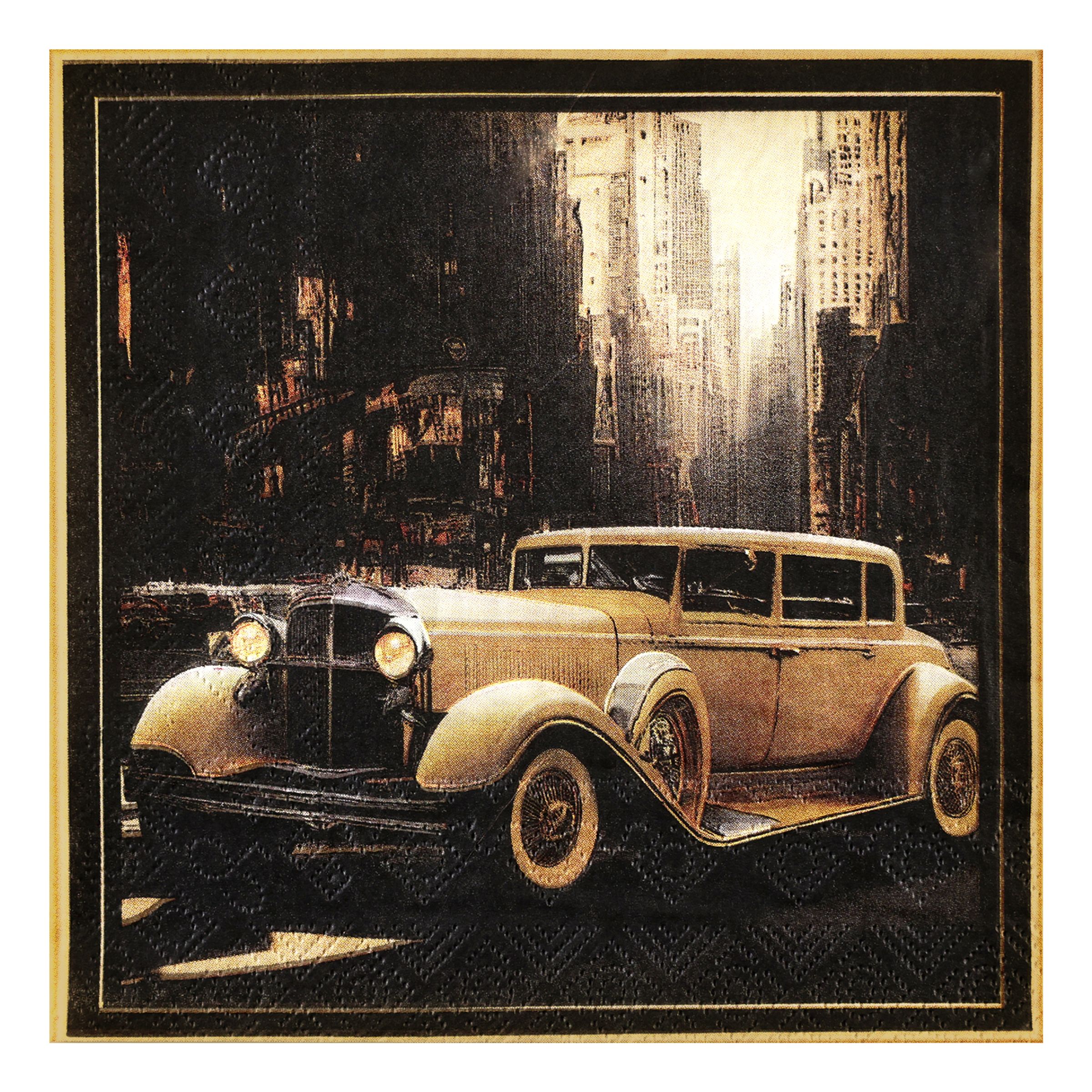 Servetter Gatsby Noir inkluderar tjugo stycken pappersservetter med ett svart och guldfärgat 20-tals-motiv föreställande en klassisk bil. Komplettera gärna med annan dukning ur samma kollektion för ett fullbordat Gatsby-tema!