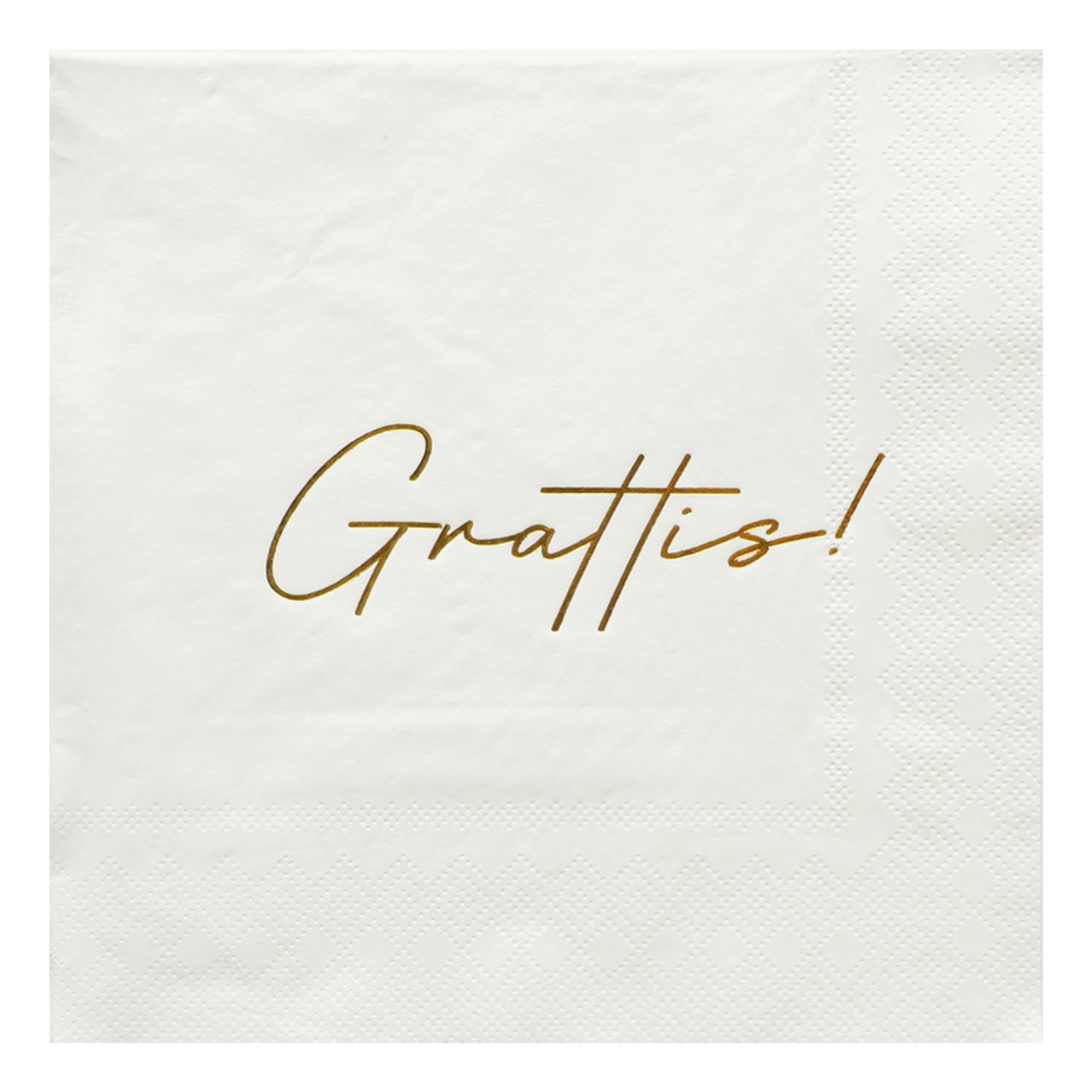 Servetter Grattis inkluderar sexton stycken vita pappersservetter som kommer med texten "Grattis" skrivet på båda sidor. Servetterna är vikta och mäter 16,5 x 16,5 centimeter.