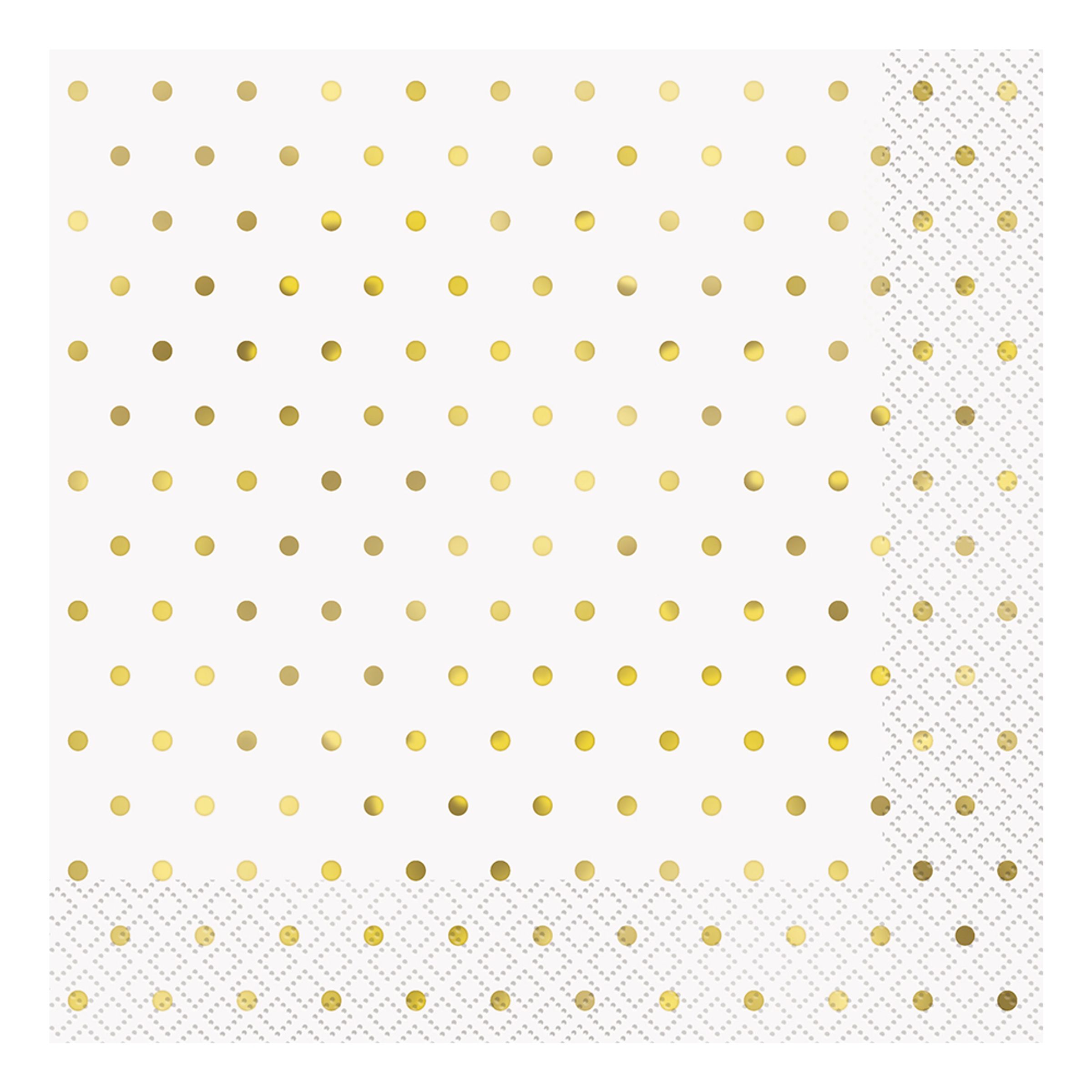 Guld är lika med fest! Här får du ett paket med vita servetter med guldfärgade prickar. De passar fantastiskt bra när du ska duka upp ett riktigt festbord. Det kan vara ett bröllop, ett dop, ett födelsedagskalas, en nyårsfest eller något annat festligt tillfälle. Kombinera med en duk som matchar och gärna fina ljus och blommor. Nu är festbordet klart så nu fattas bara maten och dina gäster.
