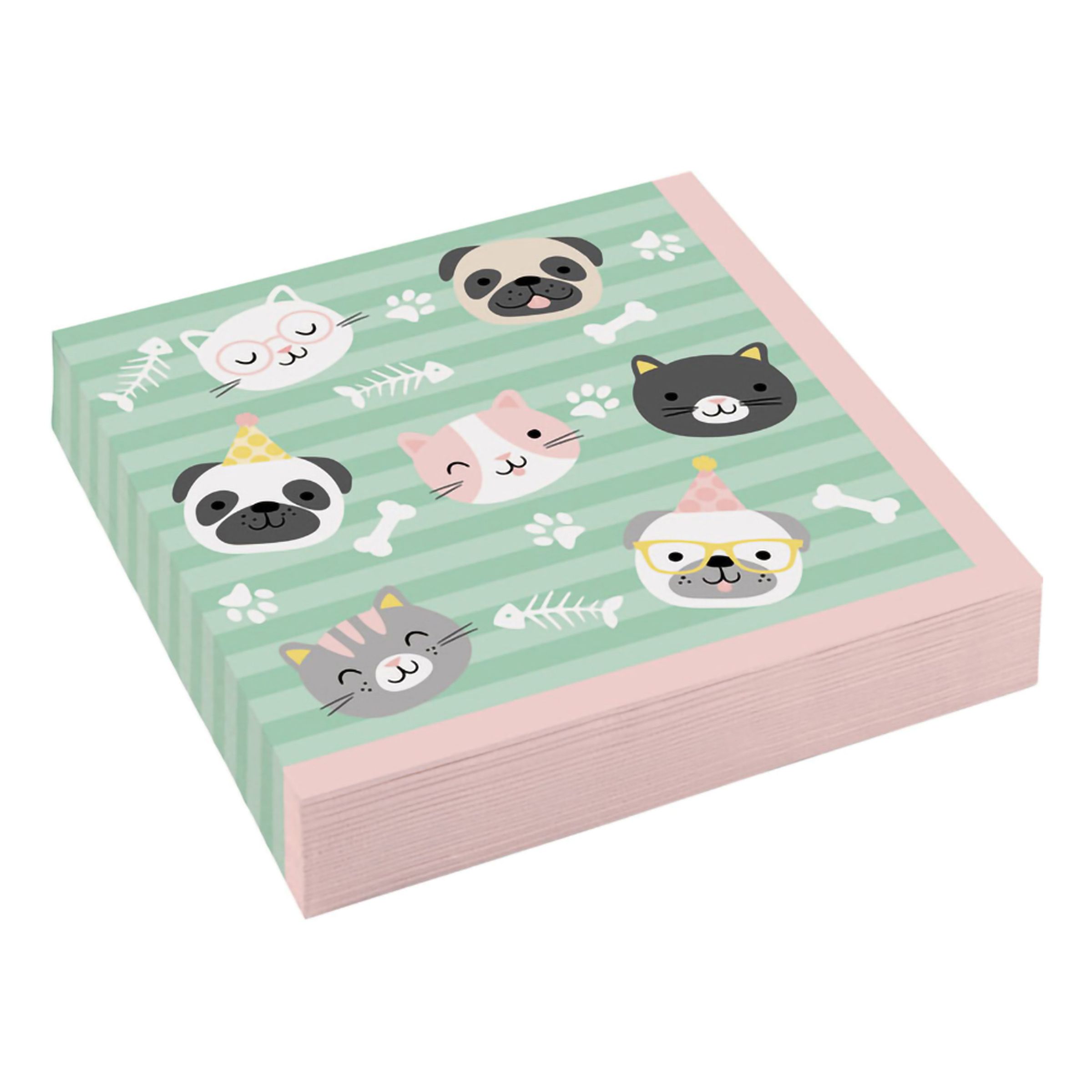 Servetter Hello Pets inkluderar tjugo stycken servetter som kommer motiv föreställande katter och hundar. Matcha gärna med annan dukning ur samma kollektion för ett fullbordat djurtema på barnkalaset.