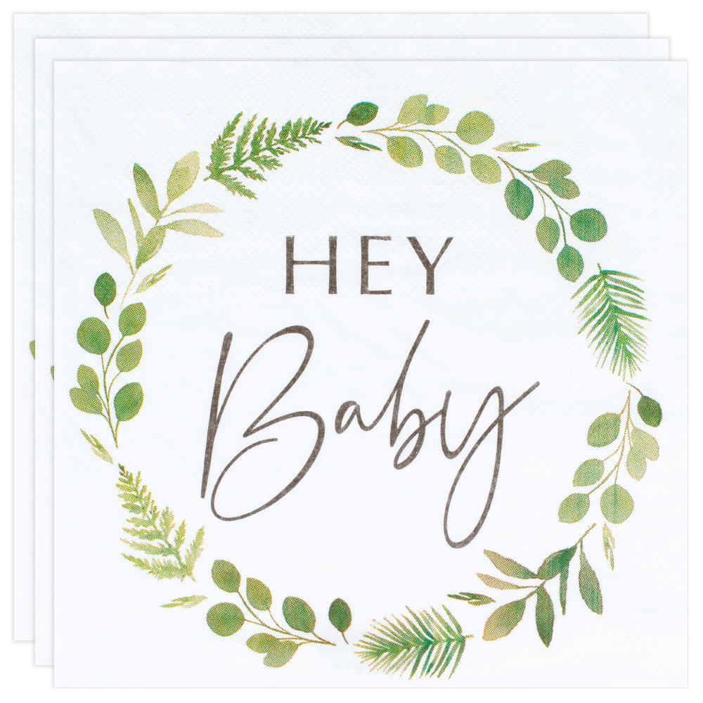 Till babyshower behövs en riktigt snygg dukning och det får du med dessa fina "Hey Baby" servetter med motiv av en fin grön krans, perfekt pappersservetter och tillbehör för en riktigt härlig gender neutral baby shower som passar utmärkt med andra fina och festliga baby dekorationer, Hey Baby servetter blir ett supersnyggt pynt och härlig dekoration för en dag att minnas.