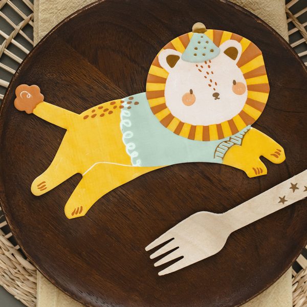 Servetter Lejon omfattar ett 20-pack servetter i form av ett gult lejon med en turkos tröja och hatt.