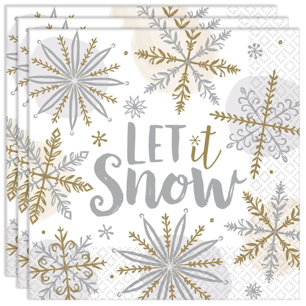Servetter Let It Snow omfattar ett 16-pack vita servetter med silvriga och guldiga motiv av snöflingor och dekorativ "Let It Snow" text. Servetterna har två lager och mäter 33 x 33 cm utvikta.