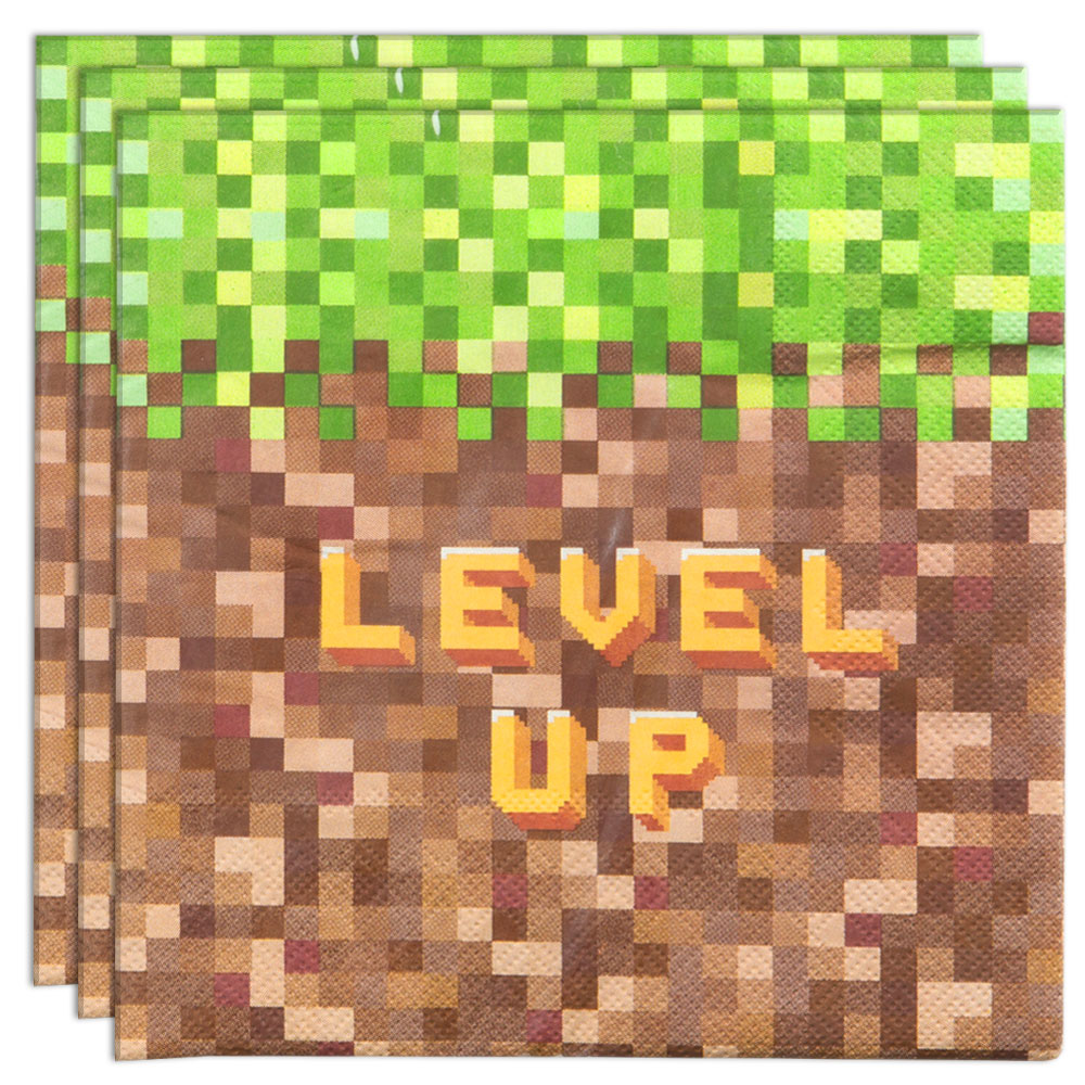 Servetter Level Up omfattar pappersservetter med brun och grön pixlad bakgrund och gul "Level up" text. Servetterna har tre lager och är ca 33 x 33 cm utvikta. Säljs i 16-pack.