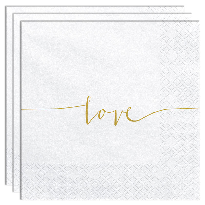 Eleganta servetter i vitt med dekorativ "Love" Text i guld som blir en fin dekoration till alla kärleksfulla dukningar. De här servetterna är med andra ord ett utmärkt val för dig som söker fina bröllopsservetter till din bröllopsdukning. Riktigt fina servetter som även passar perfekt till exempelvis alla hjärtans dag och liknande kärleksfiranden.