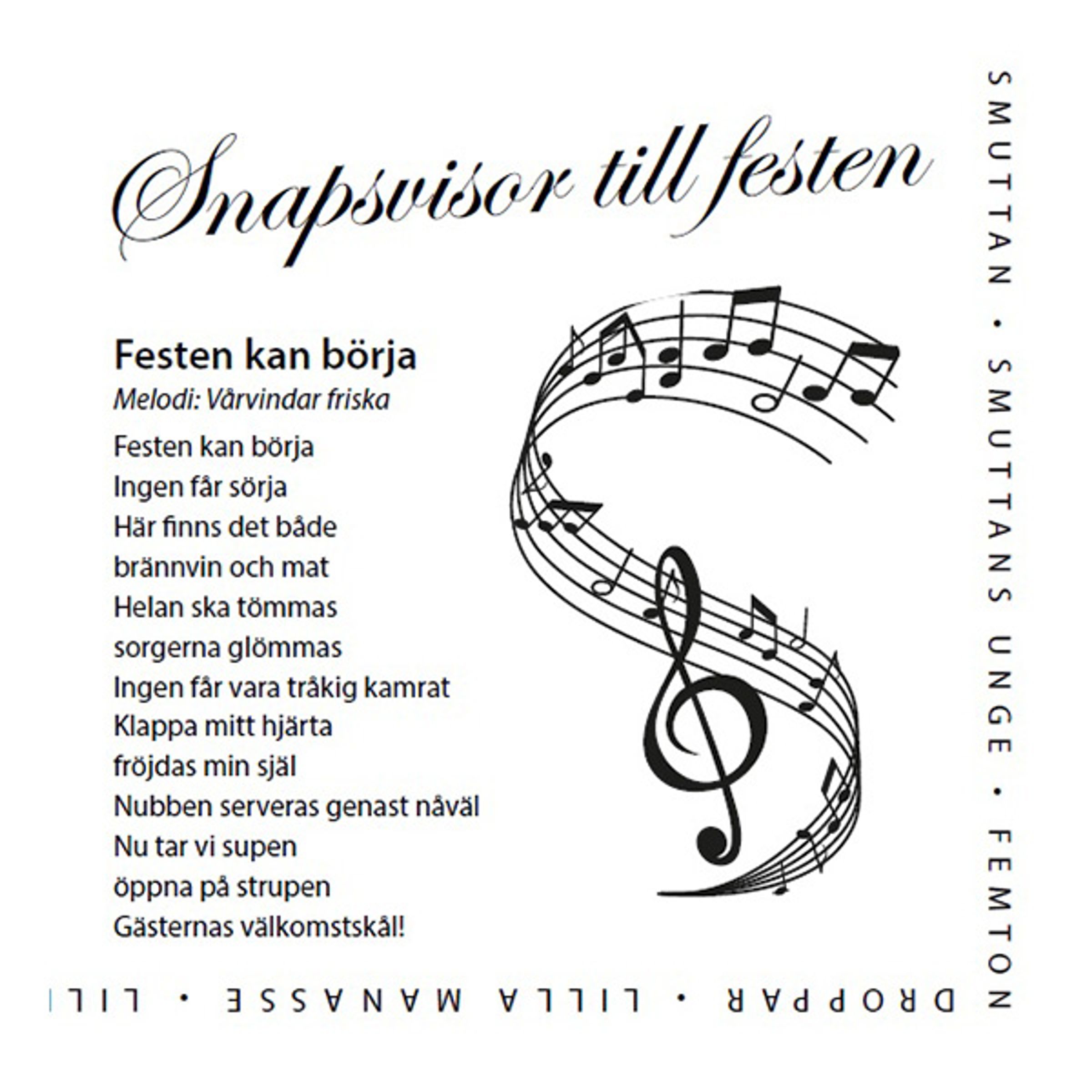 Slå 2 flugor i en smäll på festen och duka upp med dessa trevliga servetter. Servetterna torkar inte bara upp spill, de har tryckta snapsvisor också! Passar lika bra under midsommarfirandet som på kräftskivan.