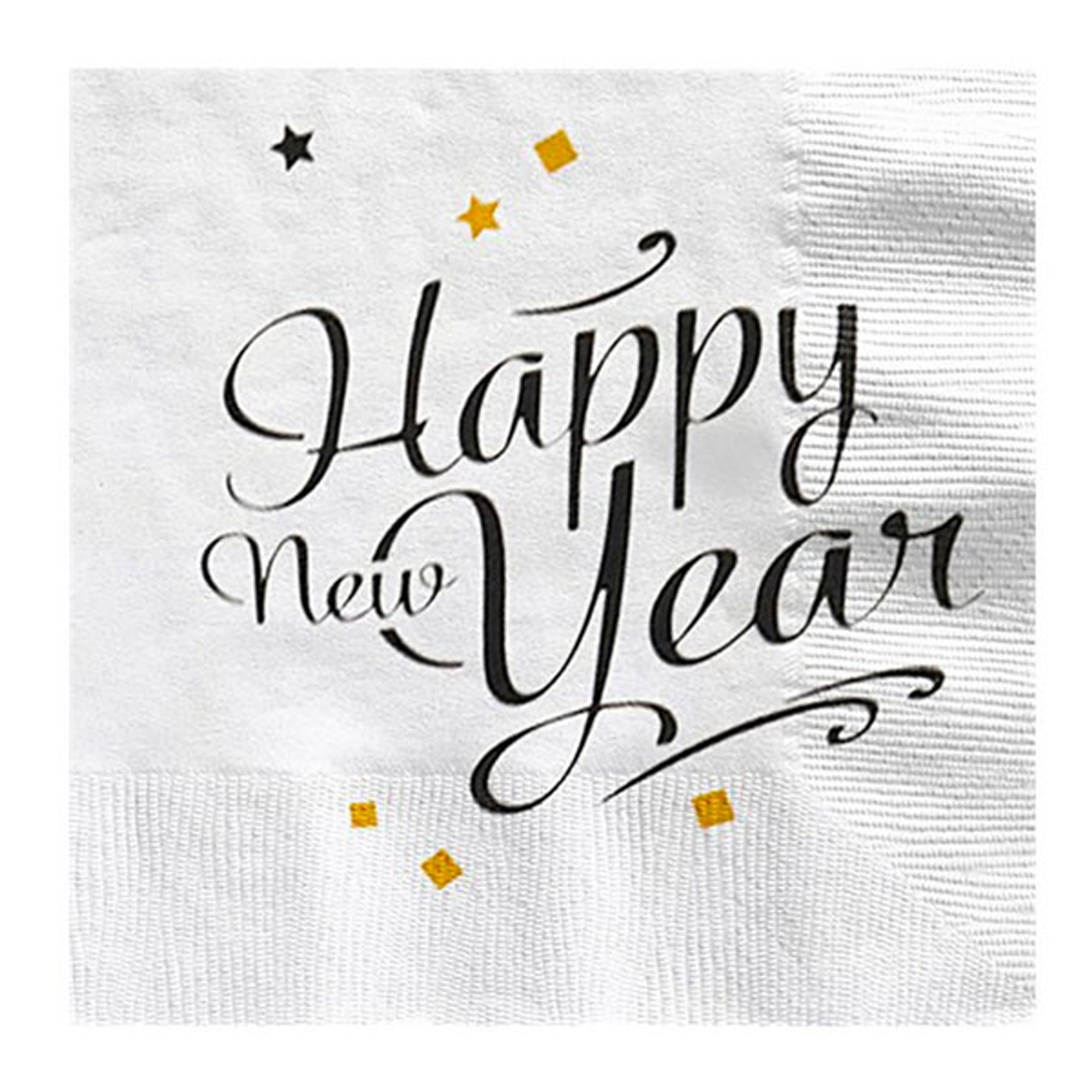 Servetter Nyår Cheers är vita pappersservetter med svart text där det står "Happy New Year". Runt texten finns stjärnor och diamanter i guld och svart. Komplettera gärna med till exempel ballonger och sugrör i guld.
