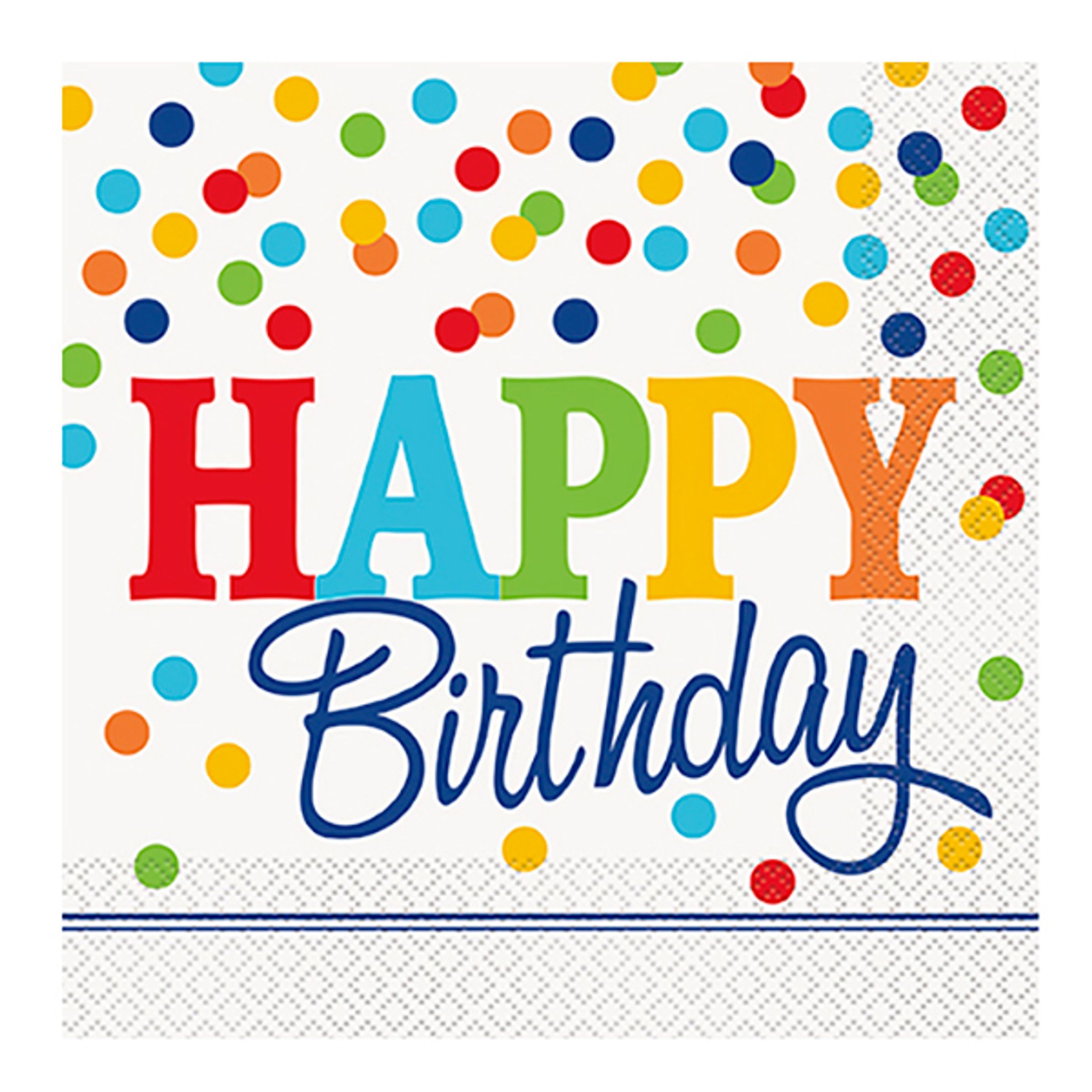 Vackra och färgsprakande servetter i ett multipack som dekoreras av konfetti och texten "HAPPY birthday" i färgglada och vackra bokstäver. Perfekt för födelsedagsfesten, oavsett ålder.