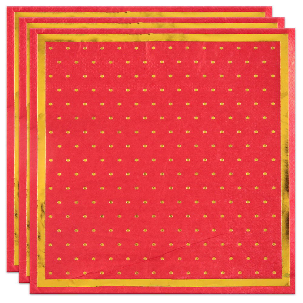 Servetter Prickar Röd och Guld omfattar ett 20-pack röda servetter med guldig ram samt guldiga prickar. Servetterna mäter ca 33 x 33 cm stora utvikta.