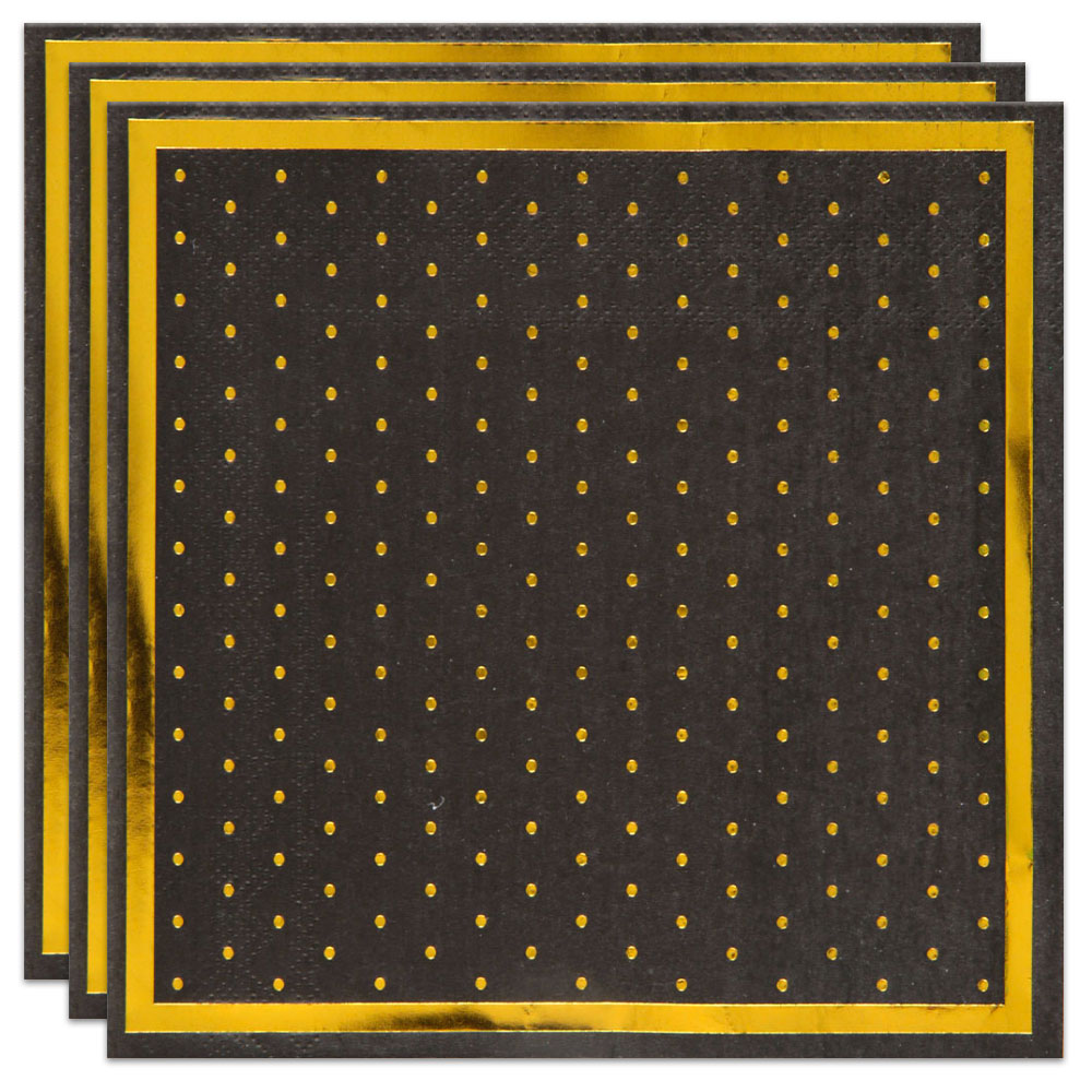 Servetter Prickar Svart och Guld omfattar ett 20-pack svarta servetter med guldig ram samt guldiga prickar. Servetterna mäter ca 33 x 33 cm stora utvikta.